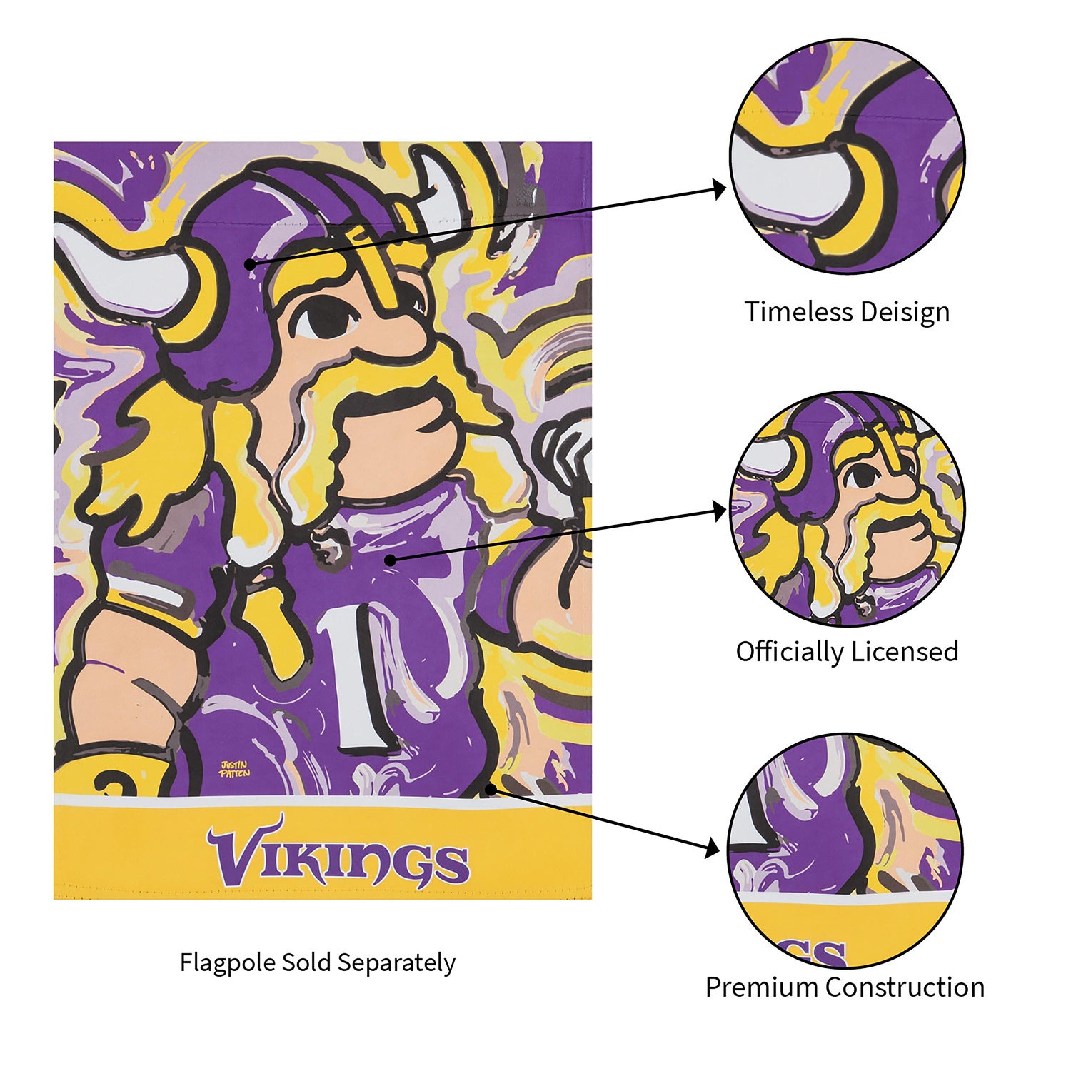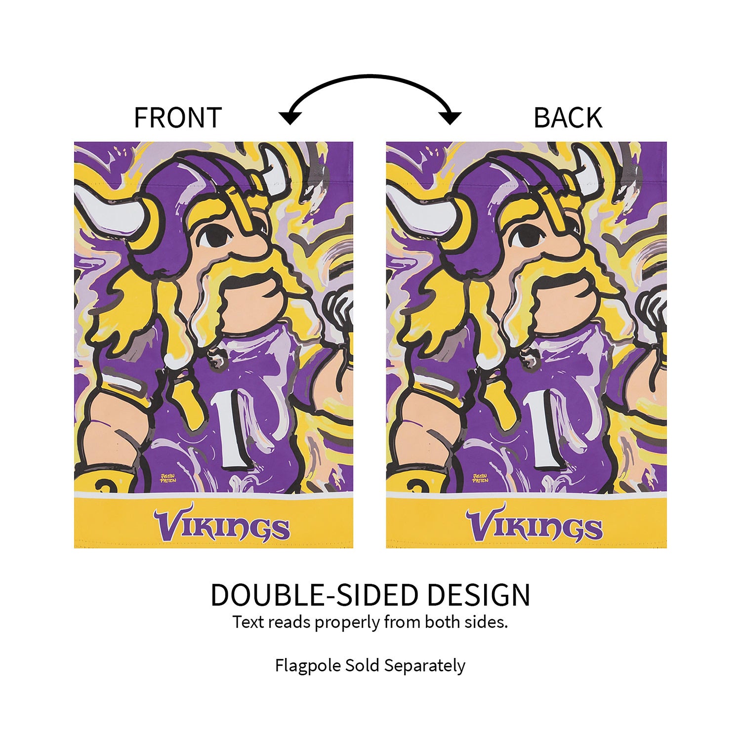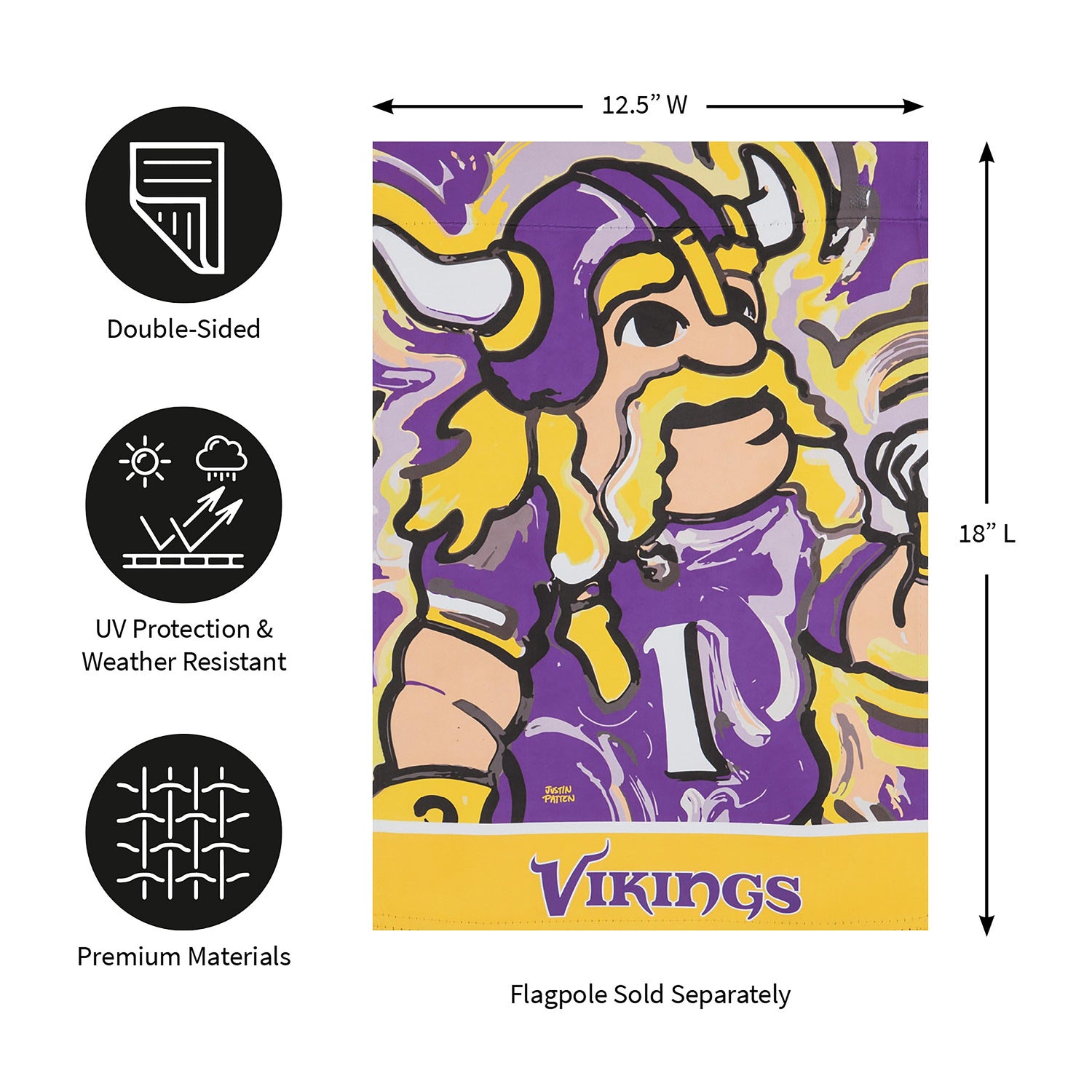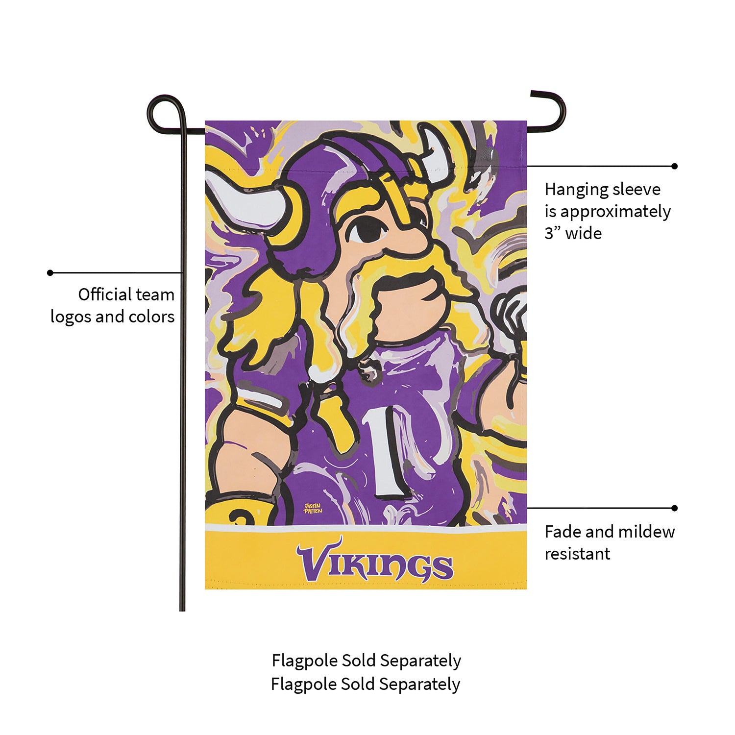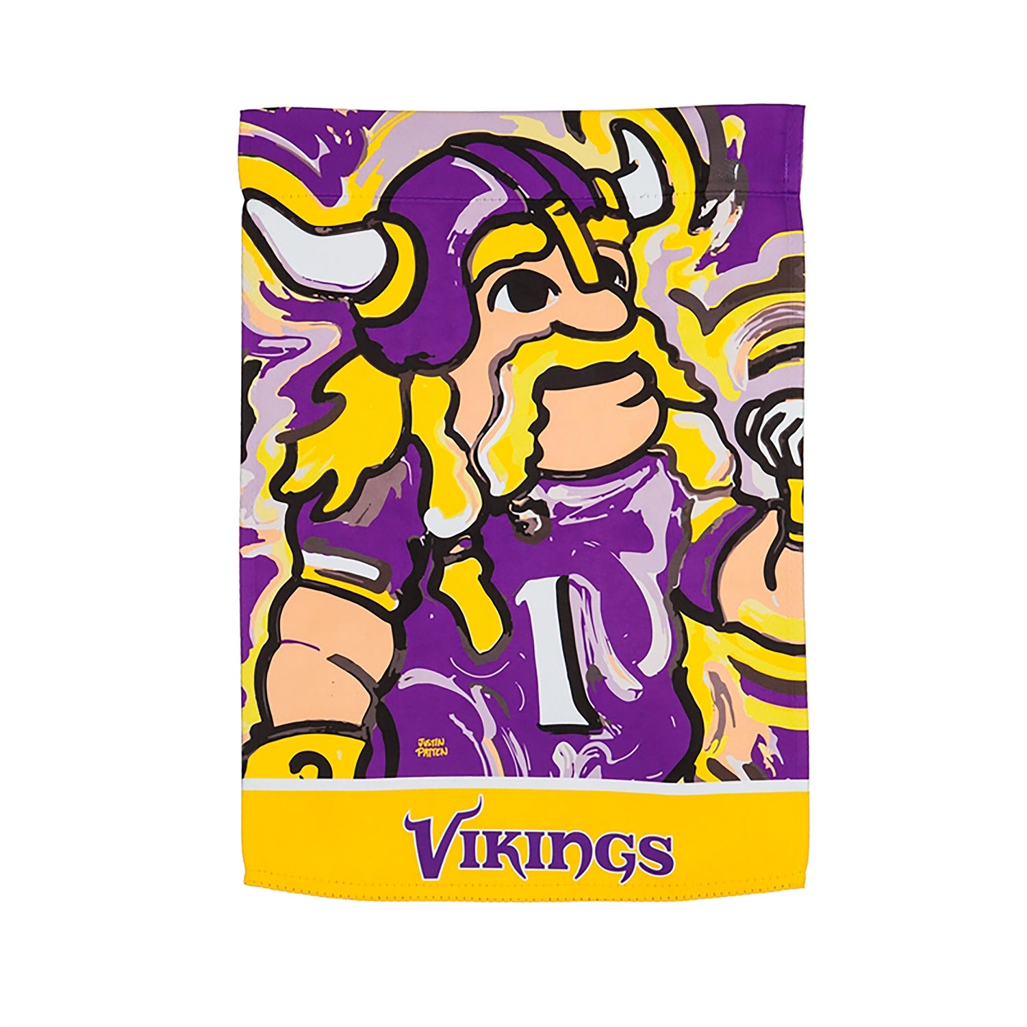 This Minnesota Vikings suede garden flag comes from the inspiring work of painter Justin Patten. This design features Viktor the Viking, the team's official mascot. Also featuring vibrant Minnesota Vikings colors, this garden flag is the perfect way to show team spirit during football season and beyond. This Patten piece is truly one of a kind and makes a great gift for a fan of the Minnesota Vikings. This Suede Reflections flag is made of medium-weight, polyester suede that provides a soft and durable texture. Artwork is heat transferred onto the sun-blocking material so that it is easily viewed from both sides. The weatherproof poly-suede will not fray or fade with continued outdoor use. The brilliant colors make any Suede Reflections flag the perfect addition to your garden or yard. This flag features a sleeve for use with any standard flagpole or stand, sold separately.