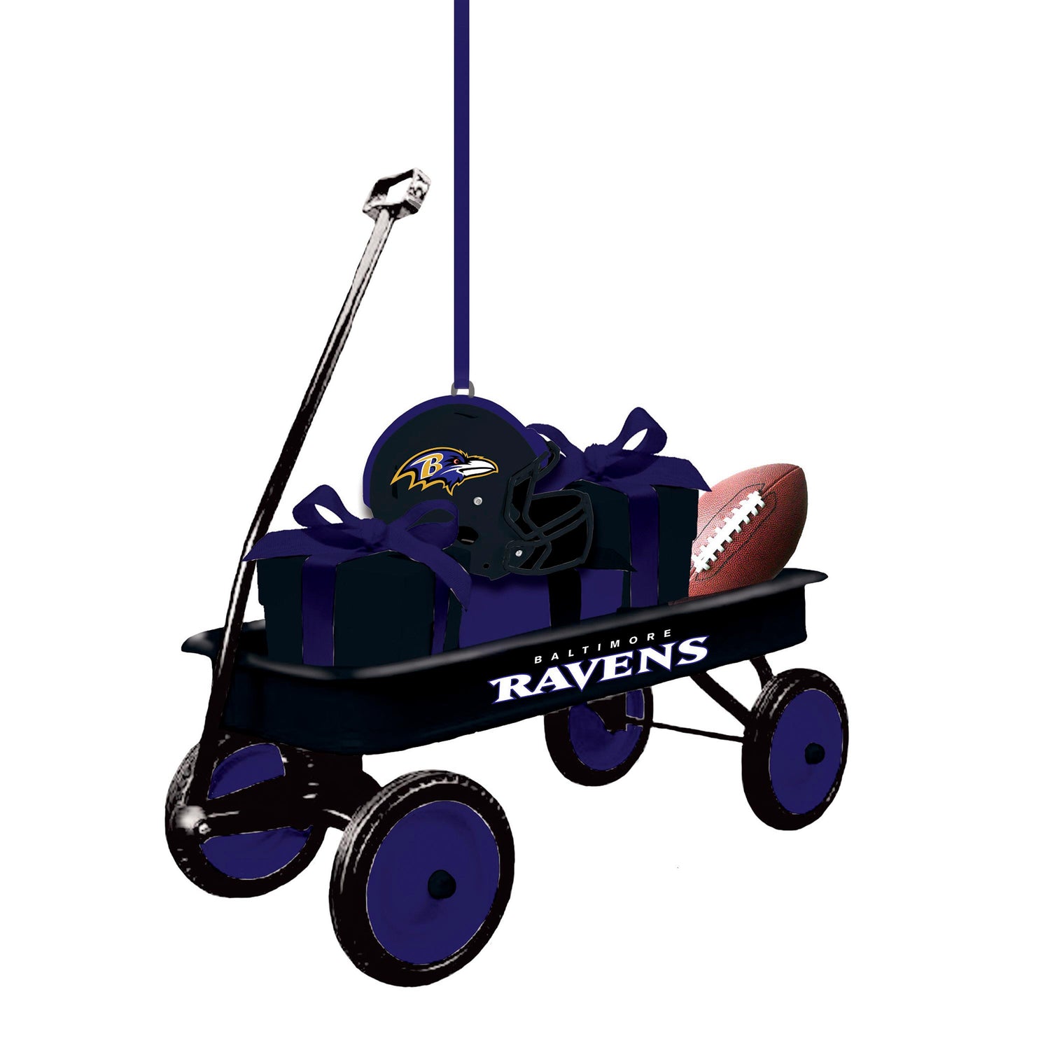 Cheer on your favorite team this holiday season with our spirited wagon ornament. Full of Christmas gifts and sports equipment, the wagon is ready to roll! Molded from plastic with hand-painted details and team logo decals, this ornament includes a ribbon for hanging. It makes a great addition to any Christmas tree, plus a great gift for any sports fan.