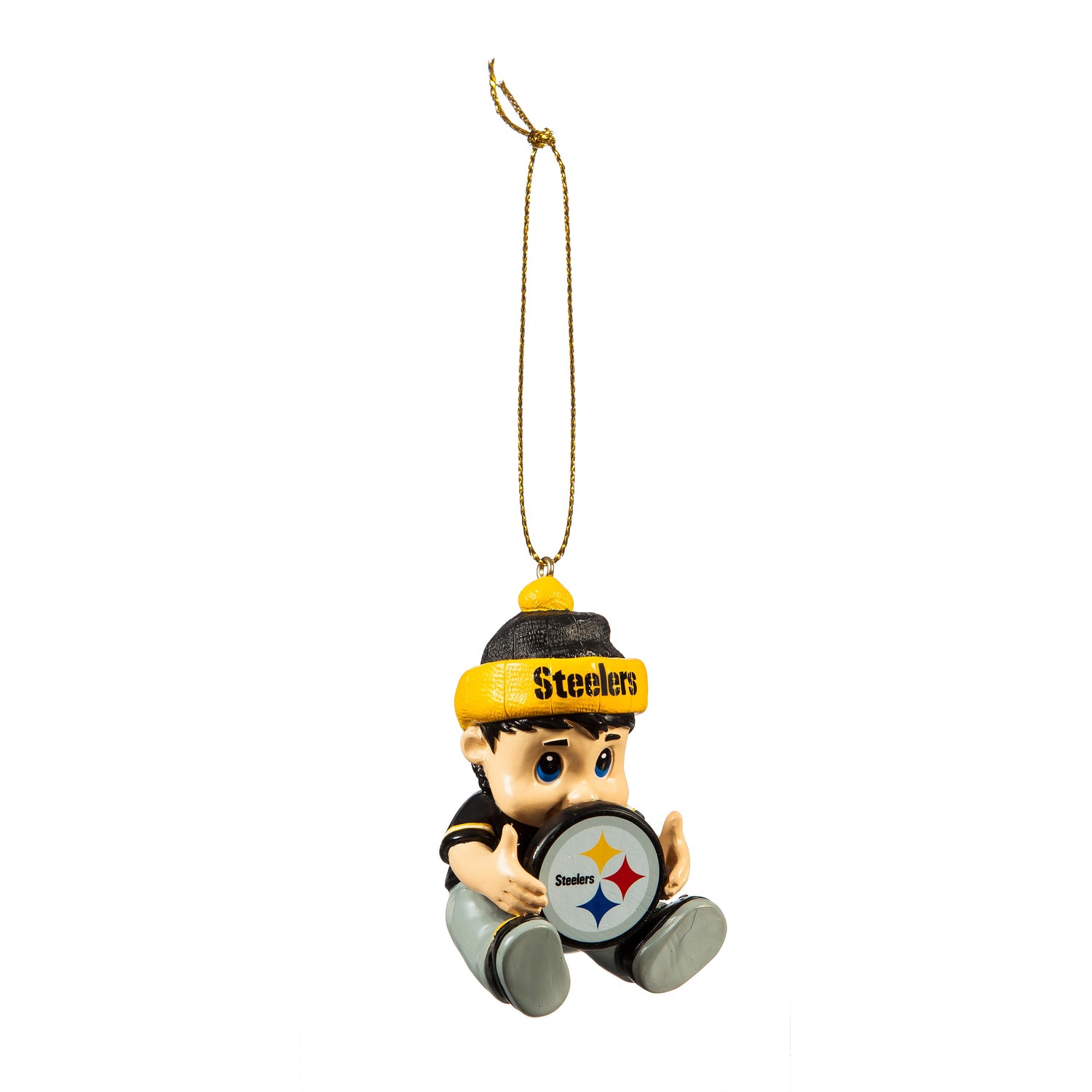Cheer on the Pittsburgh Steelers this holiday season with a precious ornament. Shaped like a little boy donning a team colored hat and holding the team's logo, it's sure to bring smiles! Crafted from plastic, this little guy is sure to bring cheer to any Christmas tree. The ornament is the perfect gift for sports fanatics.