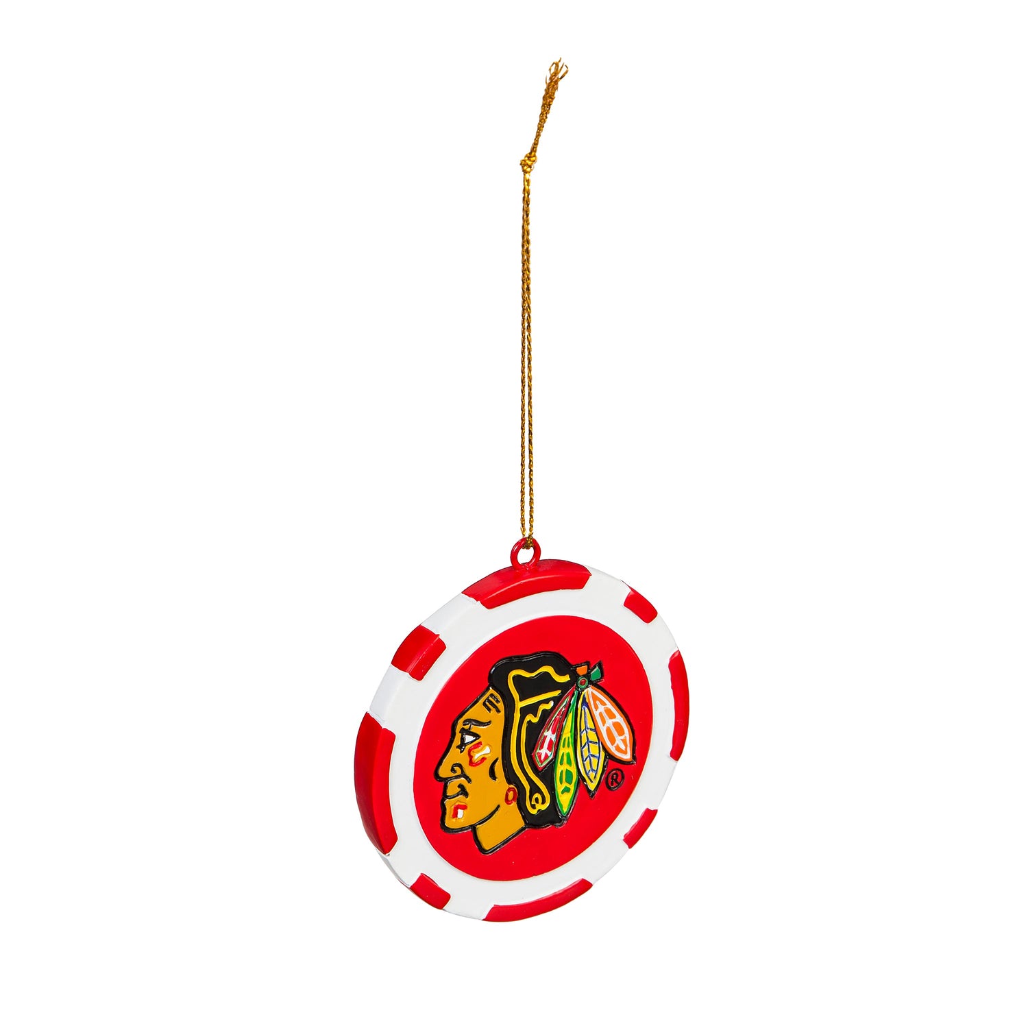 This ornament is perfect for any Chicago Blackhawks fan! Shaped like a poker chip, the design features the team's logo and a cheer in the team's colors. Crafted from plastic, the design has a golden string for easy hanging. It's perfect for decorating the Christmas tree or attaching to a wrapped gift.