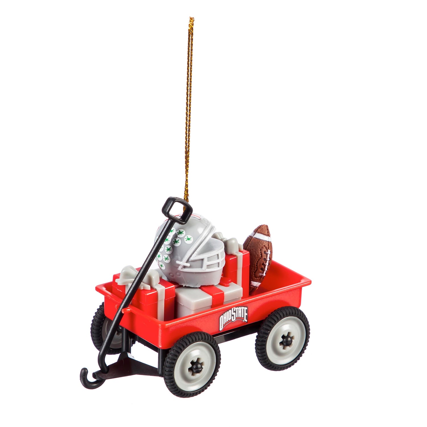 Cheer on your favorite team this holiday season with our spirited wagon ornament. Full of Christmas gifts and sports equipment, the wagon is ready to roll! Molded from plastic with hand-painted details and team logo decals, this ornament includes a ribbon for hanging. It makes a great gift for any sports fan.
