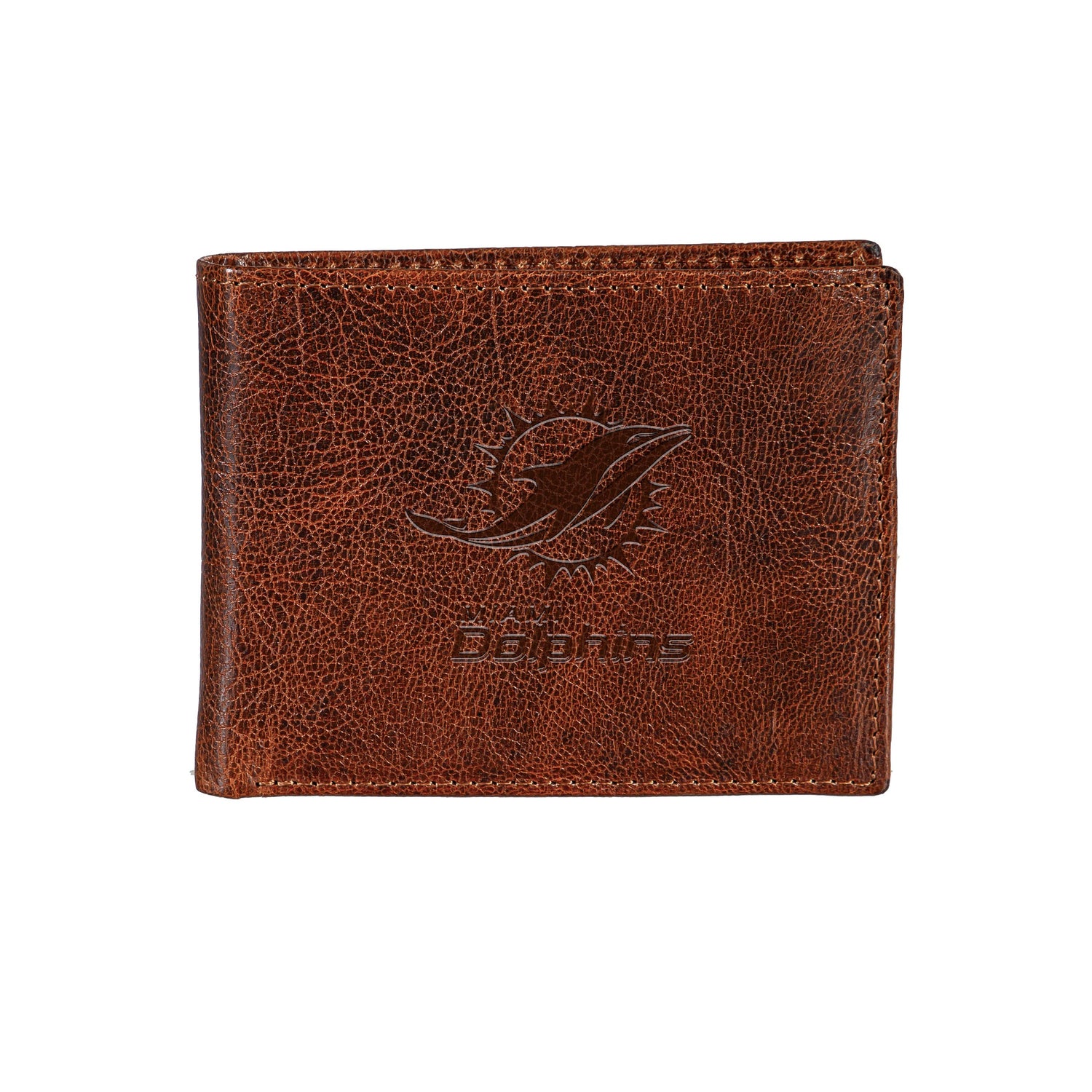 Miami Dolphins, Embossed 100% Genuine Tumbled Leather Passcase Bi-Fold Wallet, Brown