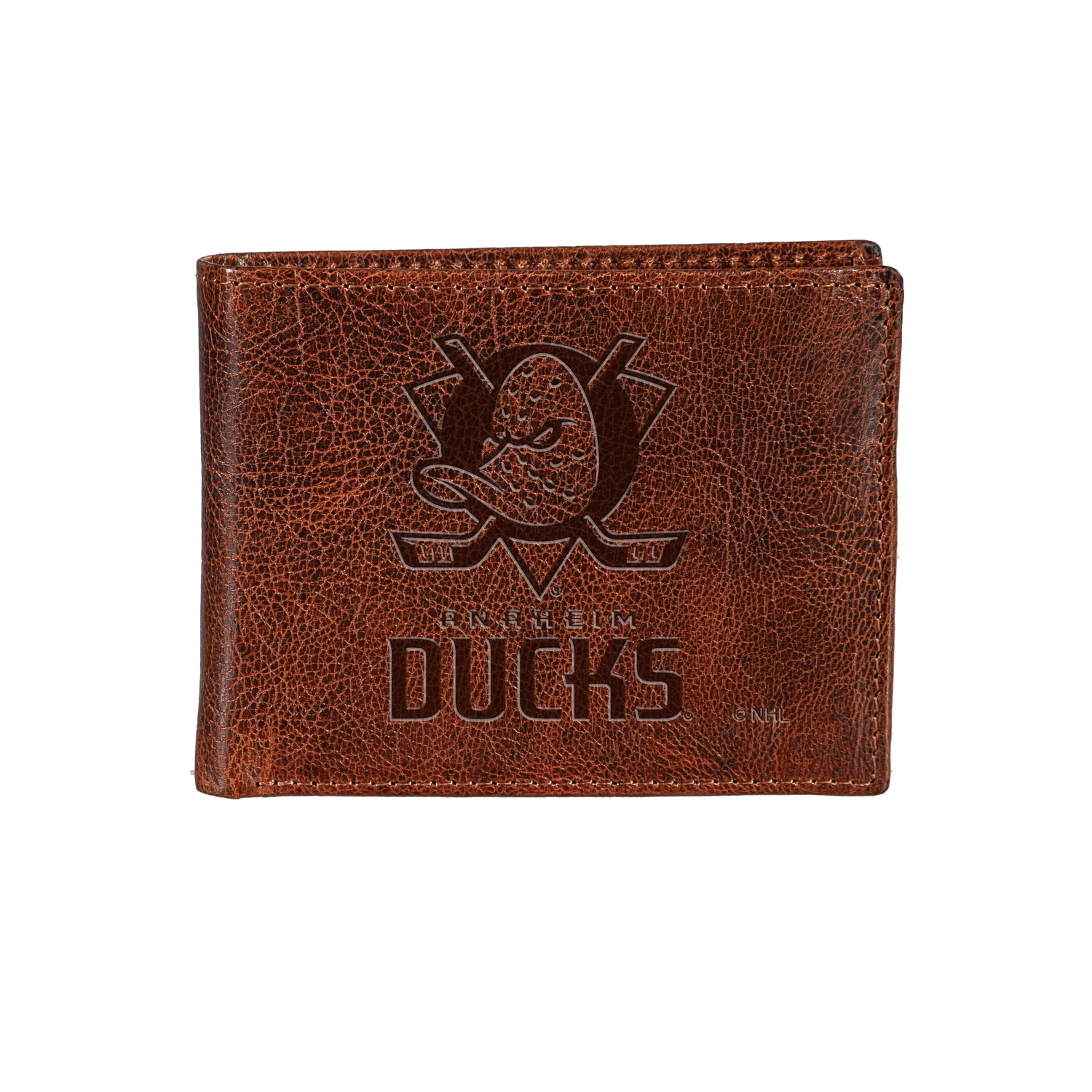 Anaheim Ducks, Embossed 100% Genuine Tumbled Leather Passcase Bi-Fold Wallet, Brown