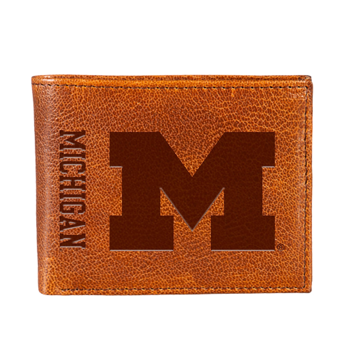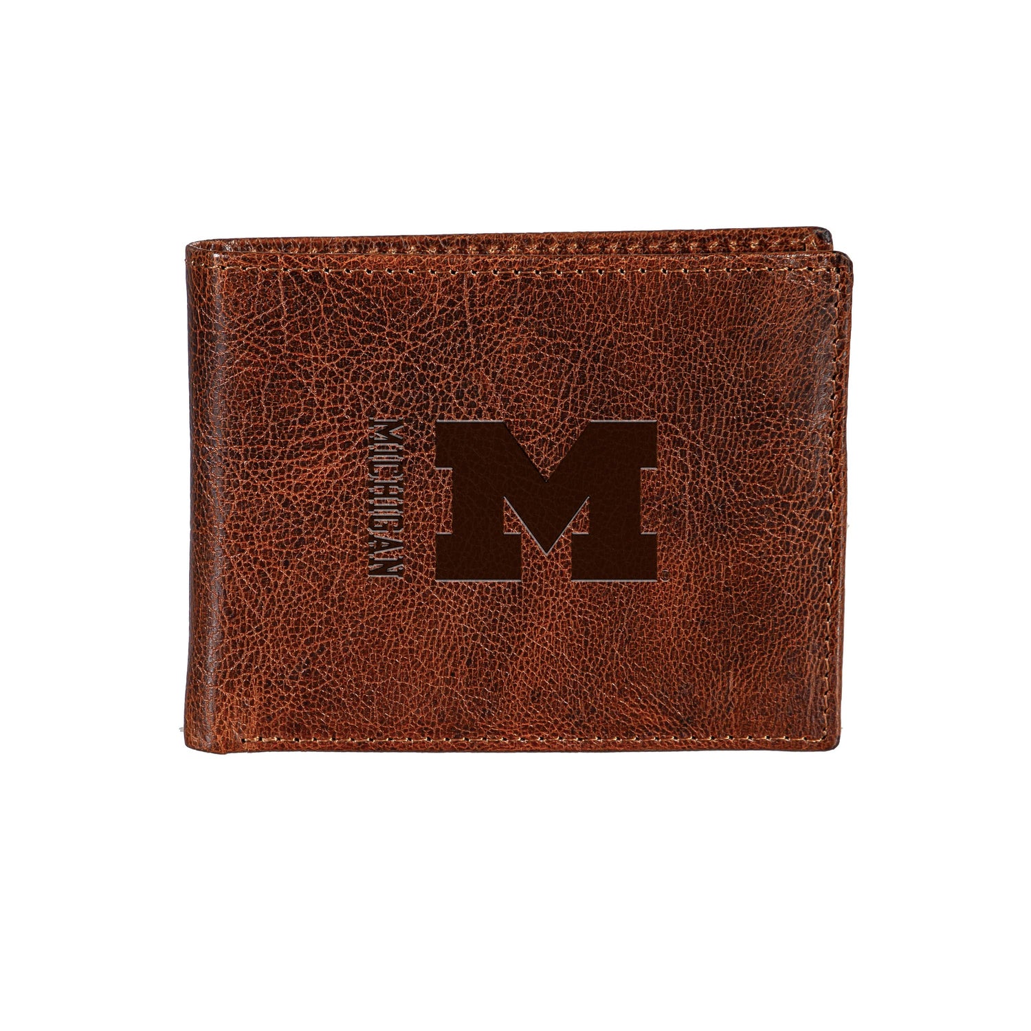 University Of Michigan, Embossed 100% Genuine Tumbled Leather Passcase Bi-Fold Wallet, Brown