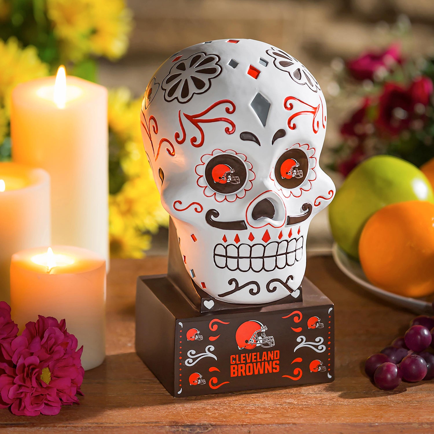 This fully dimensional Cleveland Browns Sugar Skull Statue is perfect for any fan's collection. The hand painted polystone statue features beautiful artwork inspired by Dia de los Muertos sugar skulls. Measuring over 10 inches tall, this design is the ideal addition to an office, man cave, mantel, or garden. Officially licensed colors and logos are printed with fade-resistant ink to ensure the design continues to show team pride in style.