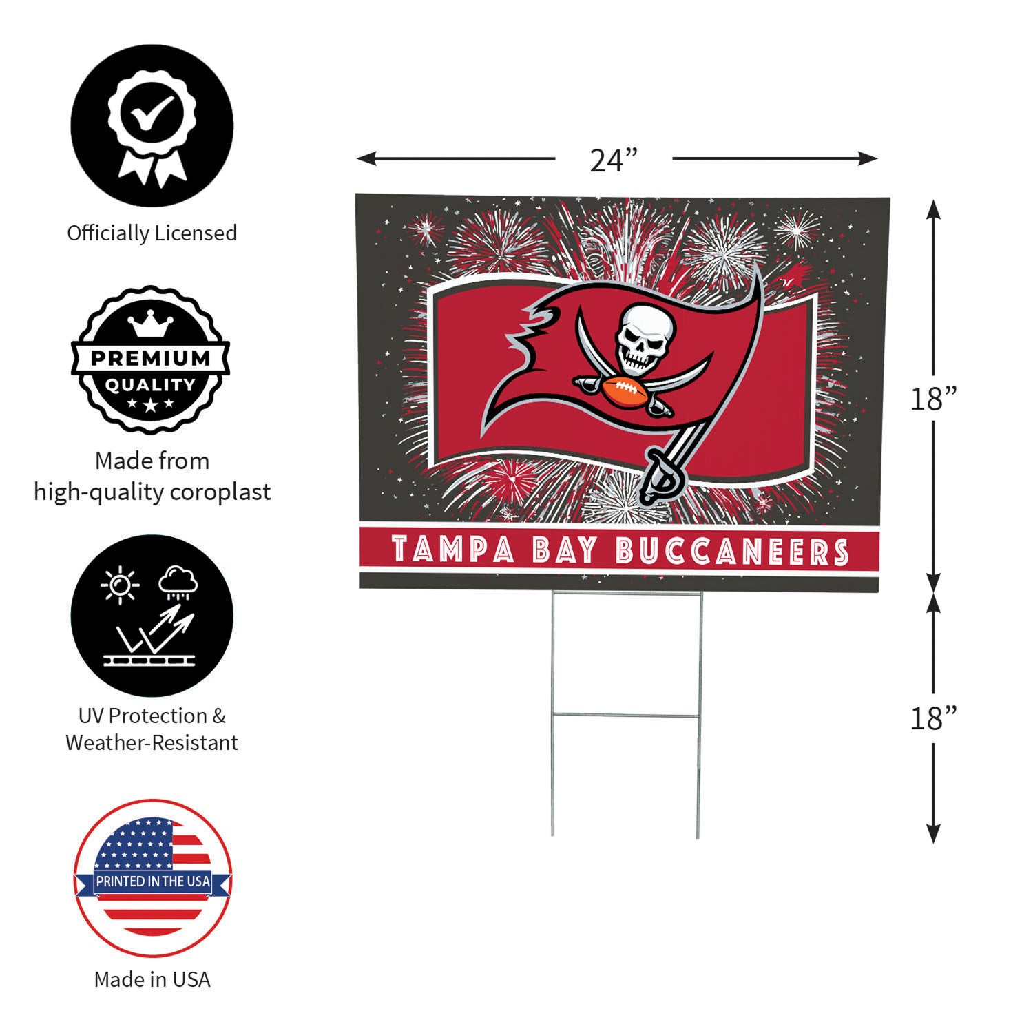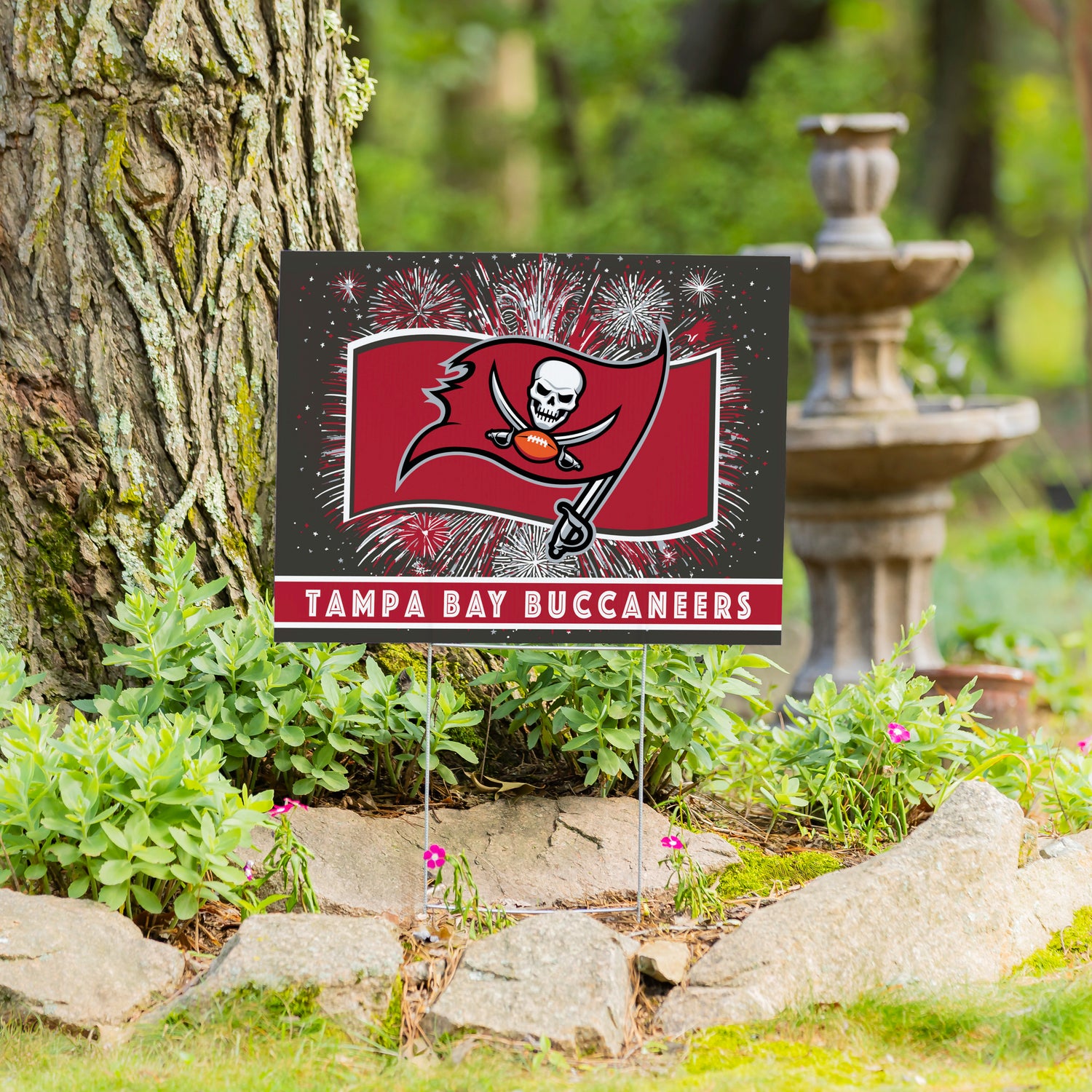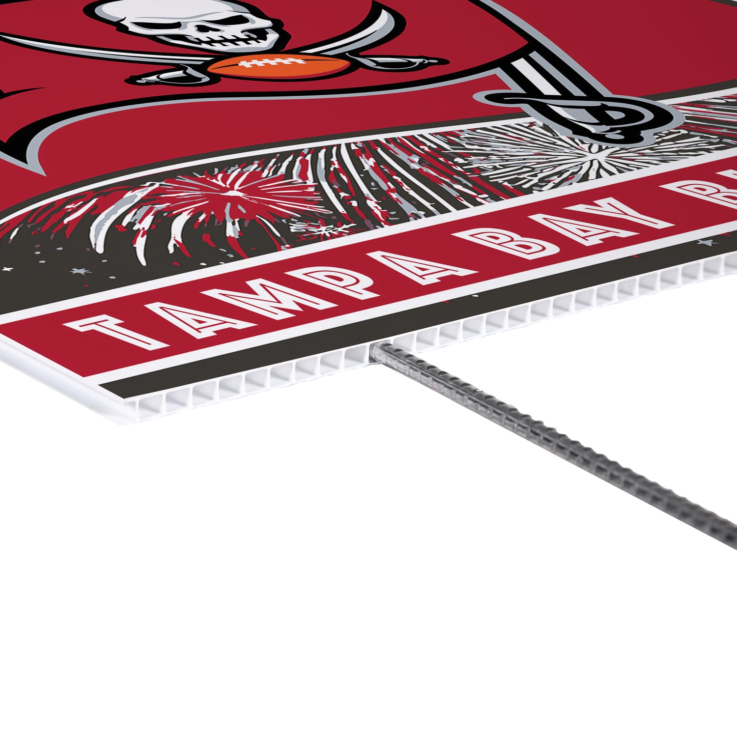 This Tampa Bay Buccaneers Yard Sign delivers bold team pride with a patriotic theme, creating instant curb appeal for front lawns, entryways, and outdoor entertaining areas. Designed for yard or lawn display, this versatile garden sign blends fandom with Americana styling to connect with customers during game days and patriotic celebrations alike. A strong fit for sports and seasonal assortments, the yard sign is easy to merchandise alongside coordinating outdoor décor and invites add-on sales with lawn sign stakes for a complete display solution.