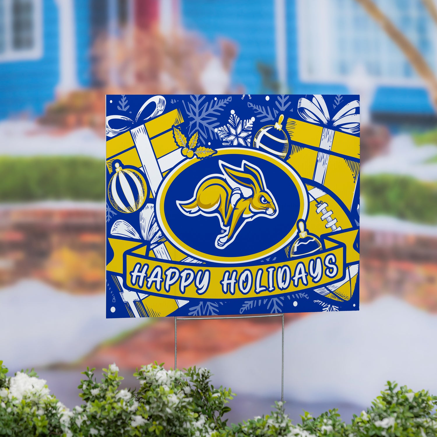 Deck the yard with this wonderful sign during the holiday season. It's the perfect mash-up Christmas and team spirit. Featuring bold team colors, jolly accents, and the officially licensed team logo, it's a must have for sports enthusiasts who love waking up early Christmas mornings to open presents. Whether cheering on the best team or welcoming Santa Claus to the home, this yard sign makes every home dashing. Crafted of durable materials with a weather-resistant design, this decor is recommended for covered outdoor use to ensure longevity.