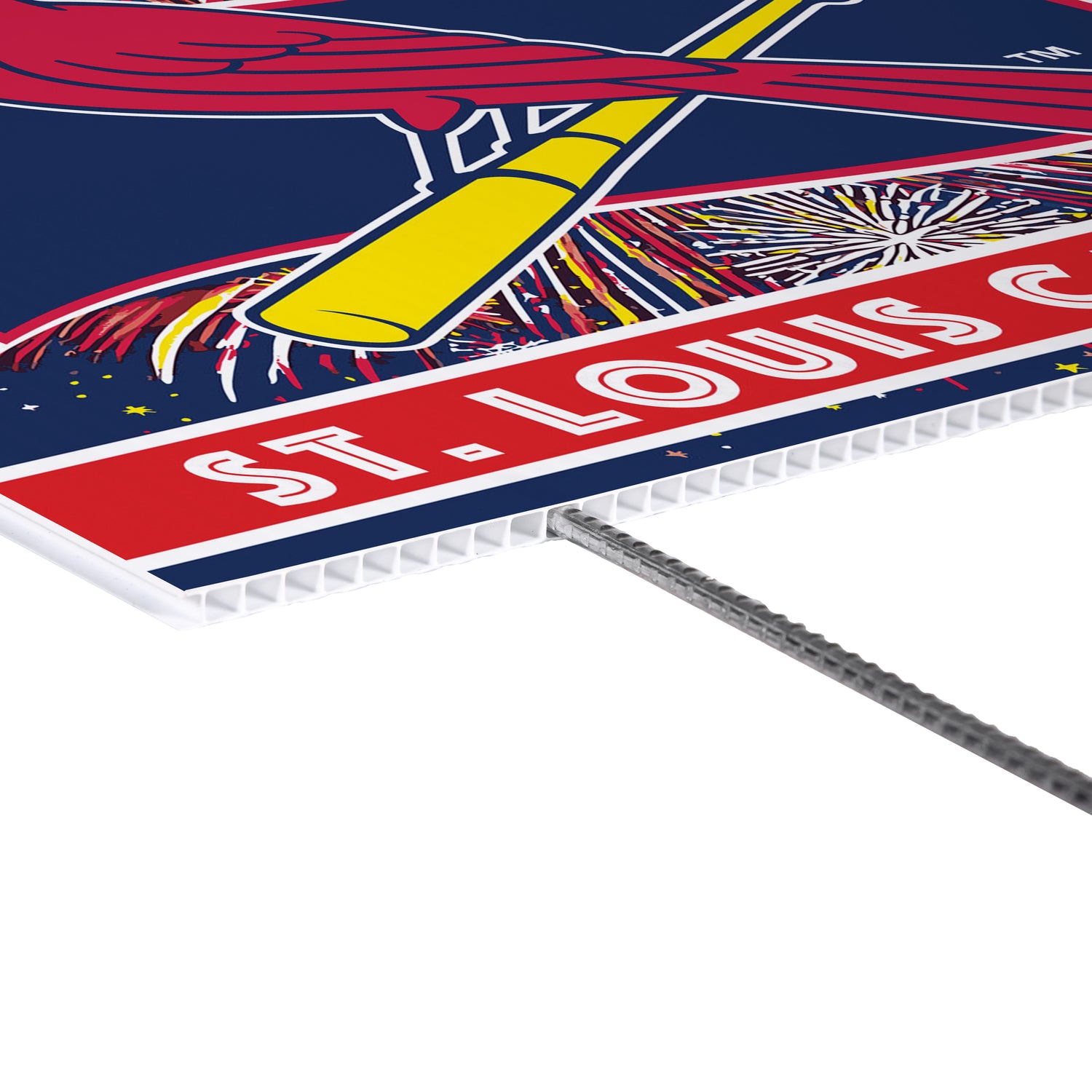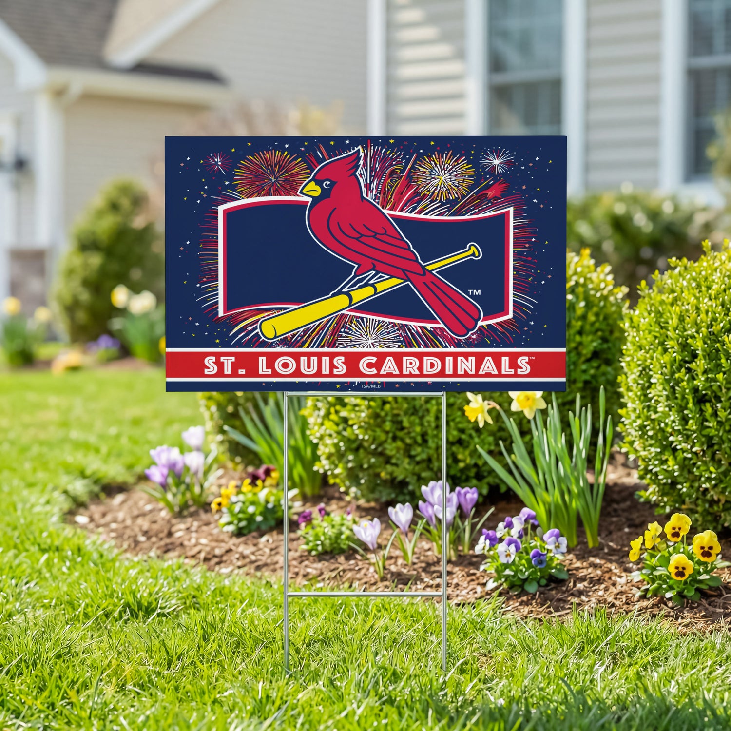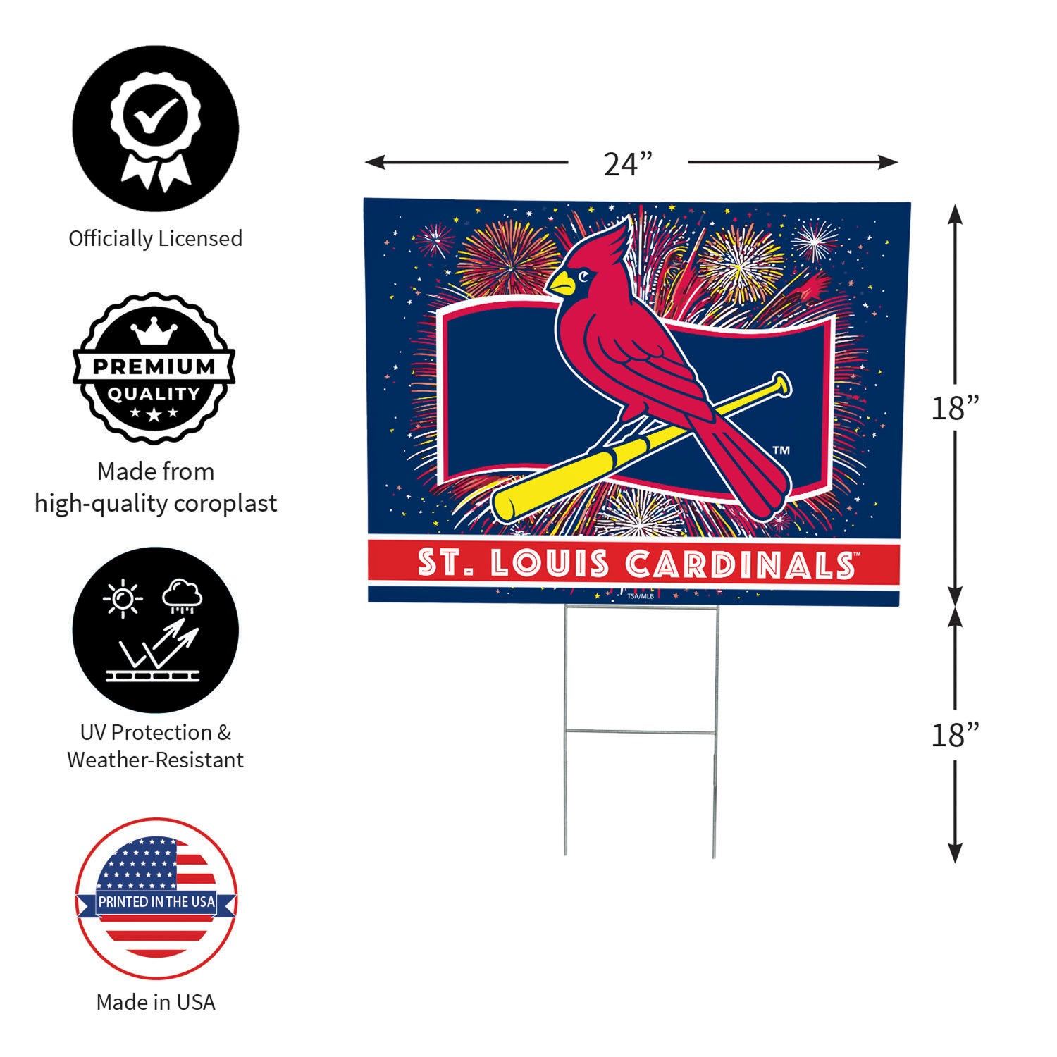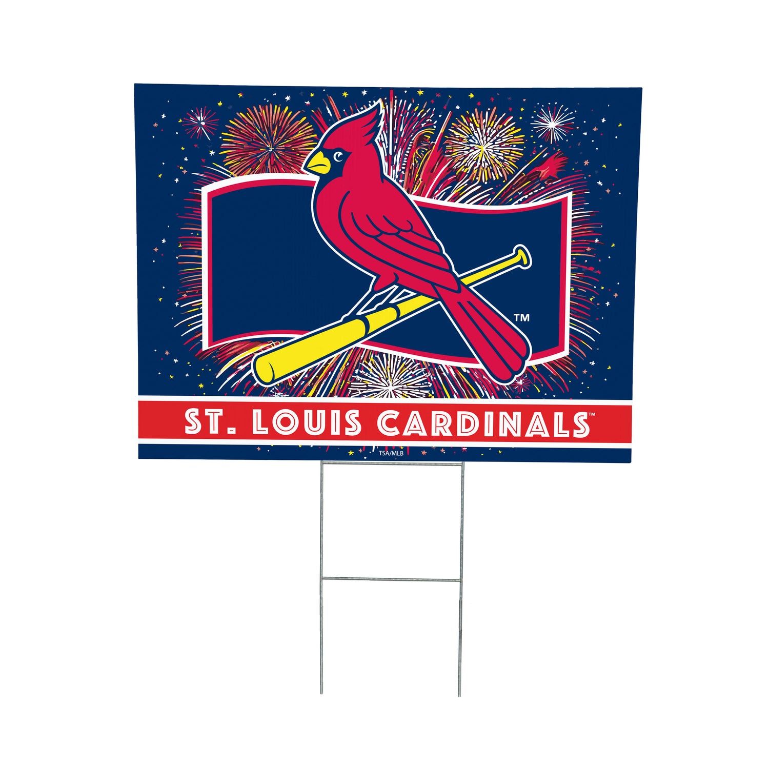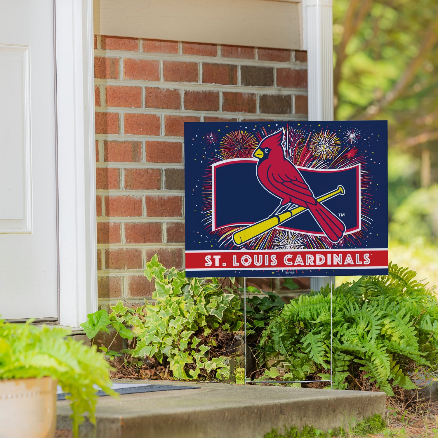 Created for everyday team pride with a patriotic twist, this St Louis Cardinals Yard Sign showcases a bold Fans Play Here design printed in the USA on durable plastic with metal components for stability, making it an easy outdoor display for lawns, gardens, and planters. It sets in place quickly with no assembly and can be moved as layouts change. The multicolored artwork delivers MLB spirit and Missouri-themed appeal that reads well from the curb, while the sturdy build supports repeat use from Opening Day through patriotic occasions. Use as an outdoor sign or garden sign to welcome guests and showcase Cardinals loyalty; simply spot clean to maintain a crisp look.