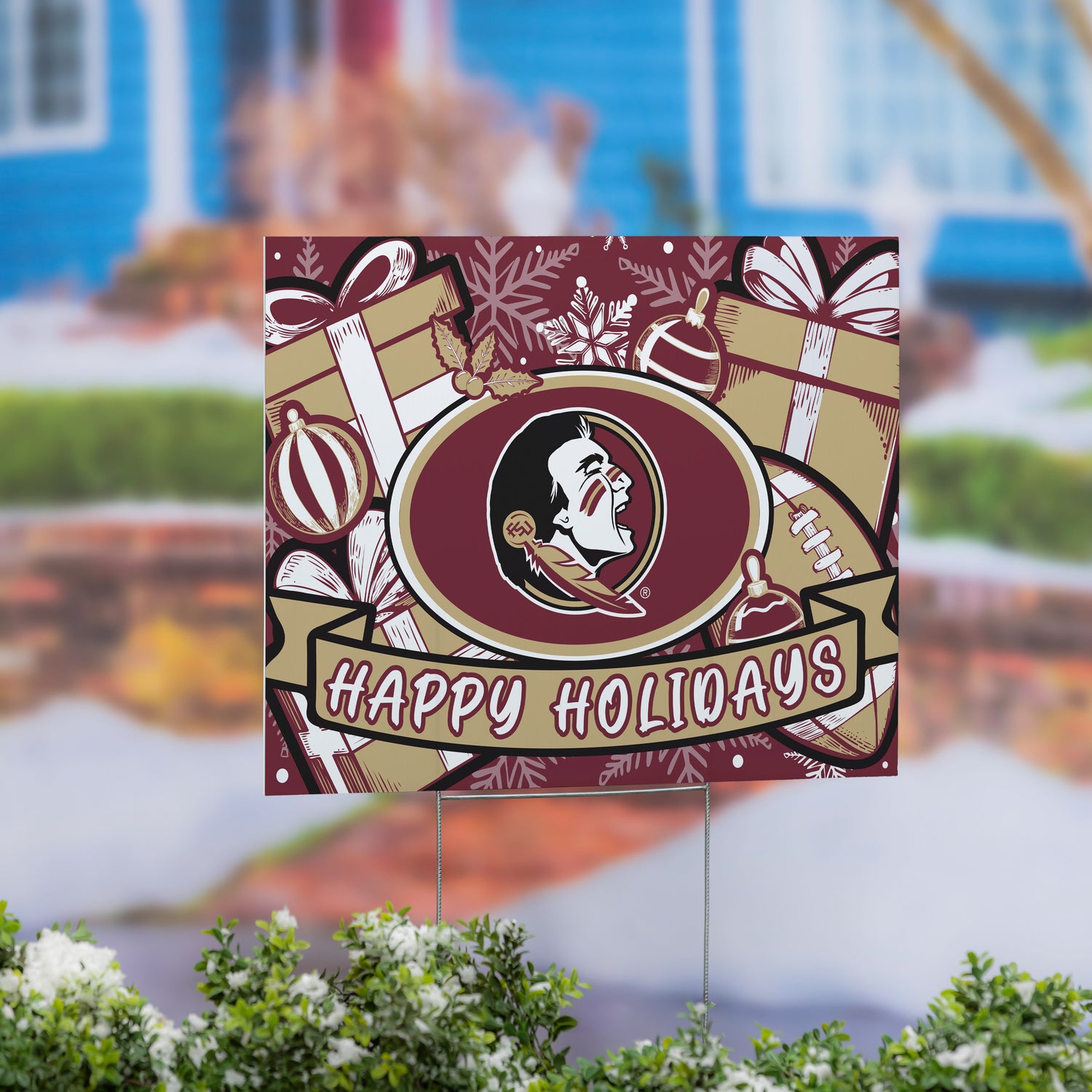 Deck the yard with this wonderful sign during the holiday season. It's the perfect mash-up Christmas and team spirit. Featuring bold team colors, jolly accents, and the officially licensed team logo, it's a must have for sports enthusiasts who love waking up early Christmas mornings to open presents. Whether cheering on the best team or welcoming Santa Claus to the home, this yard sign makes every home dashing. Crafted of durable materials with a weather-resistant design, this decor is recommended for covered outdoor use to ensure longevity.