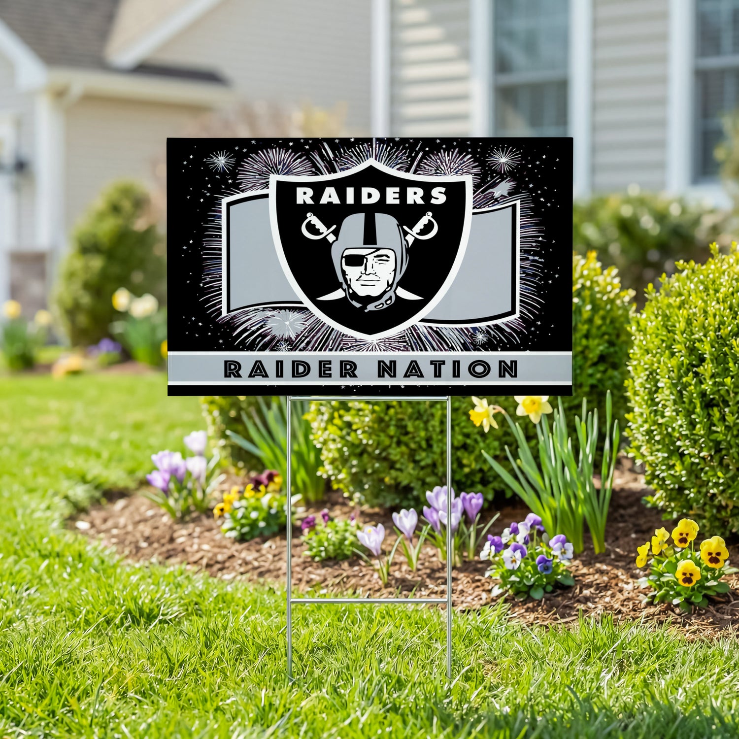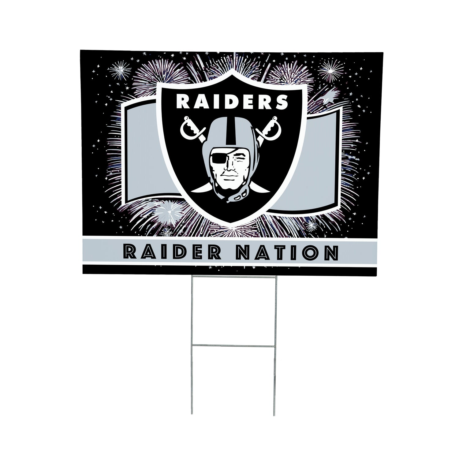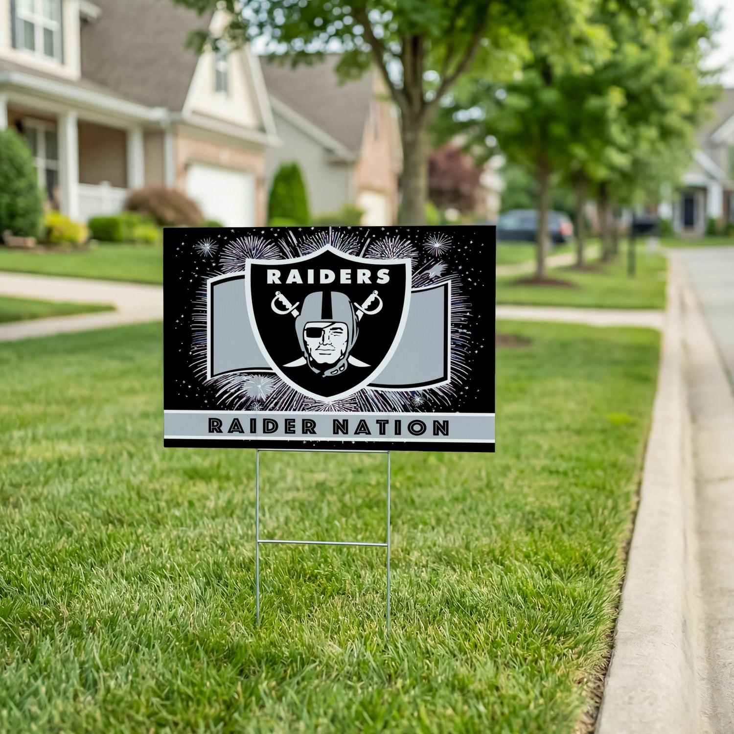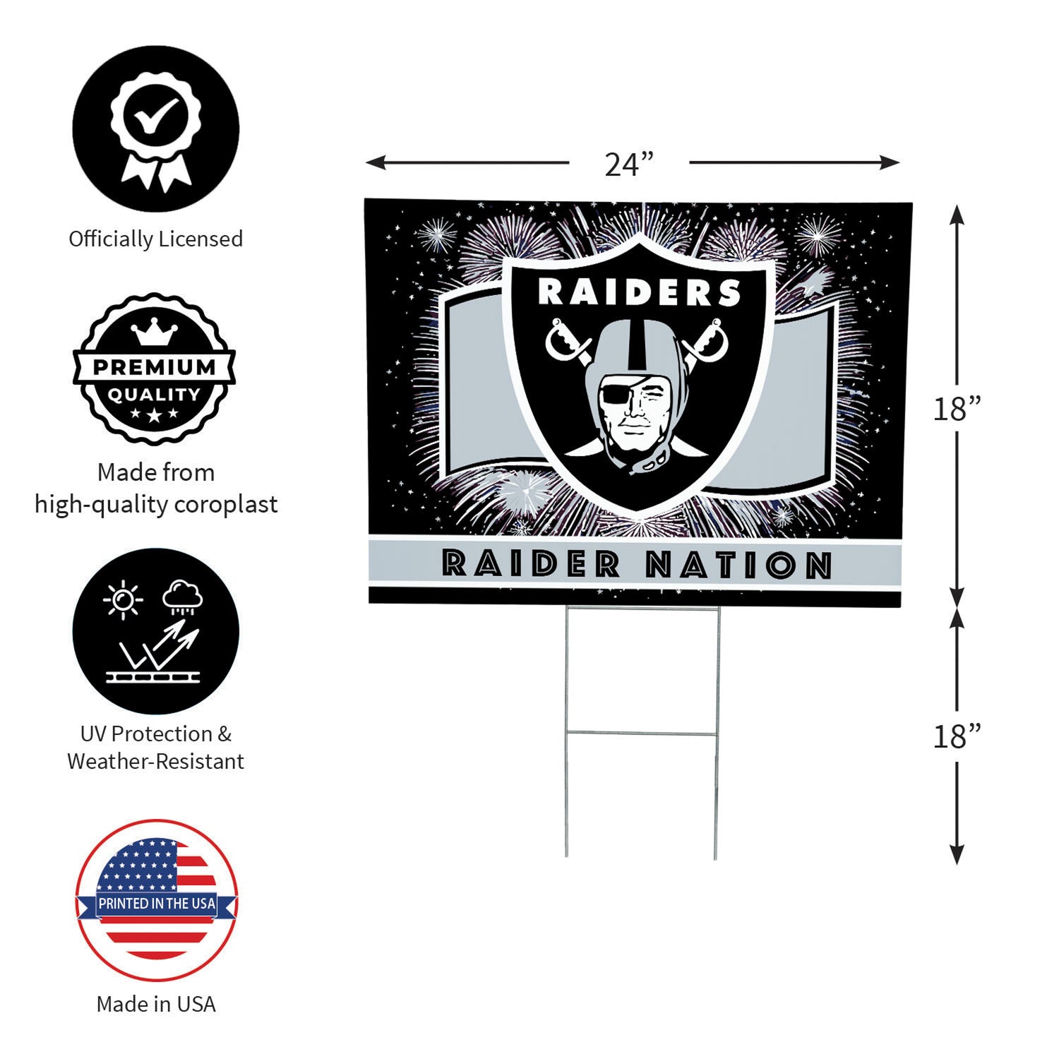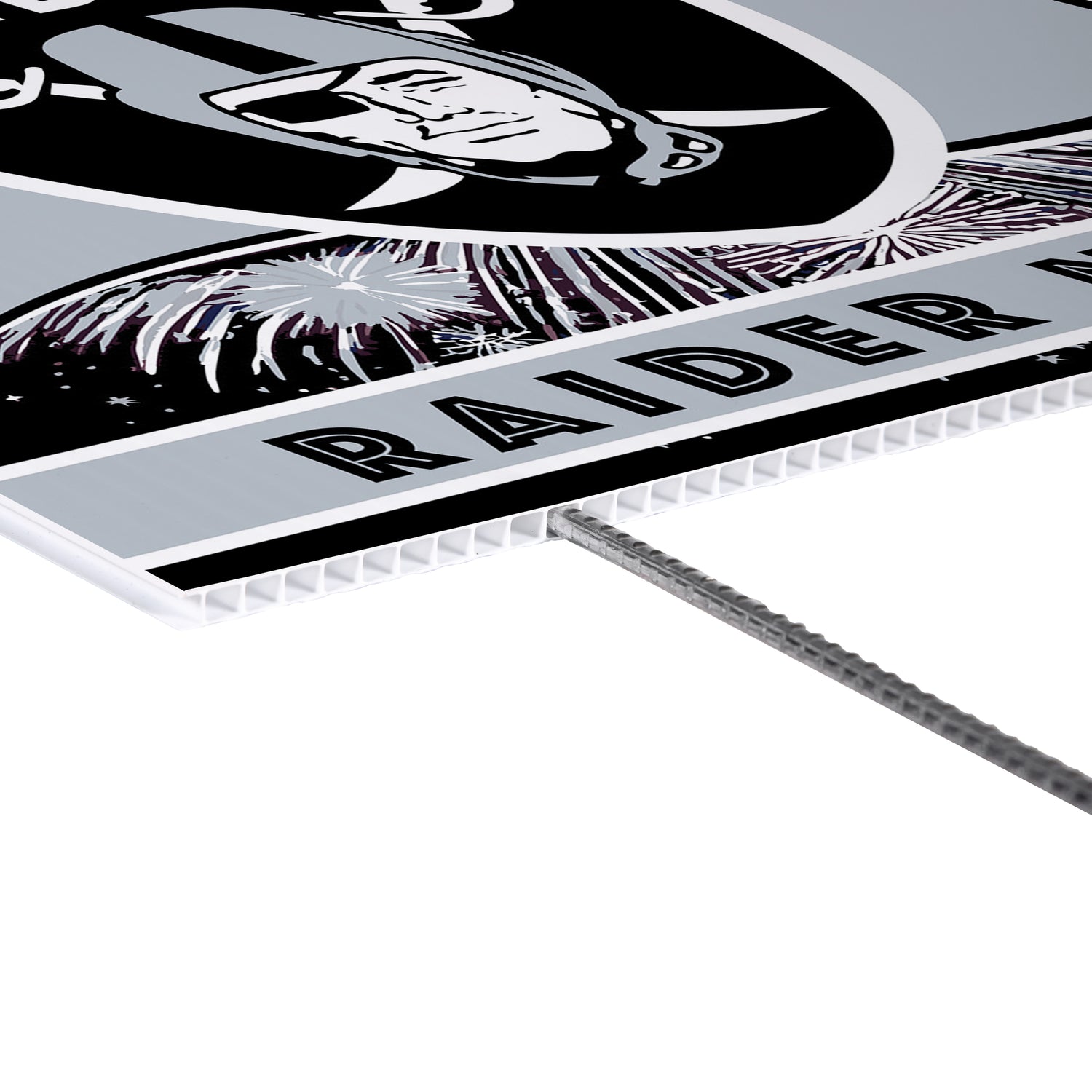 Bring bold team pride to outdoor spaces with this Las Vegas Raiders Yard Sign, a ready-to-display outdoor sign that welcomes fellow fans while celebrating patriotic spirit. Officially licensed NFL graphics are printed in the USA in bright team colors on a durable plastic panel, and the included ground stake makes placement fast and hassle-free in lawns, planters, or garden beds. Lightweight construction and outdoor-safe materials suit everyday use, from game days to patriotic events, while simple spot cleaning keeps the design looking fresh season after season; an easy win for curb appeal and team spirit as a standout garden sign or yard sign.