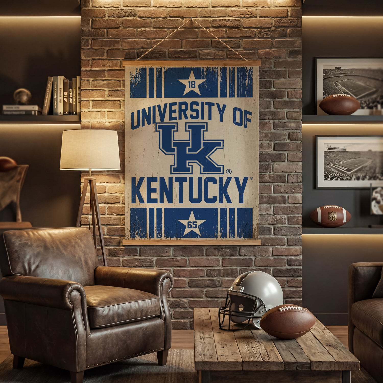Celebrate the University of Kentucky Wildcats with a statement-sized Canvas Wall Tapestry that brings collegiate spirit to interior spaces with clean, modern presence. From Team Sports America, this hanging wall tapestry pairs a durable 50% canvas textile with 50% teak wood components for a dimensional, furniture-adjacent look that merchandises well in NCAA fan assortments. MIt delivers big visual impact while remaining easy to install and reposition. A three-piece construction supports straightforward assembly, making it a practical fit for apartments, offices, and dorm room decor. Designed for indoor wall applications with simple maintenance—just wipe with a clean, dry cloth—this piece adds tactile texture, team-forward appeal, and a strong option for shoppers seeking blue and white wall art within collegiate-themed collections.