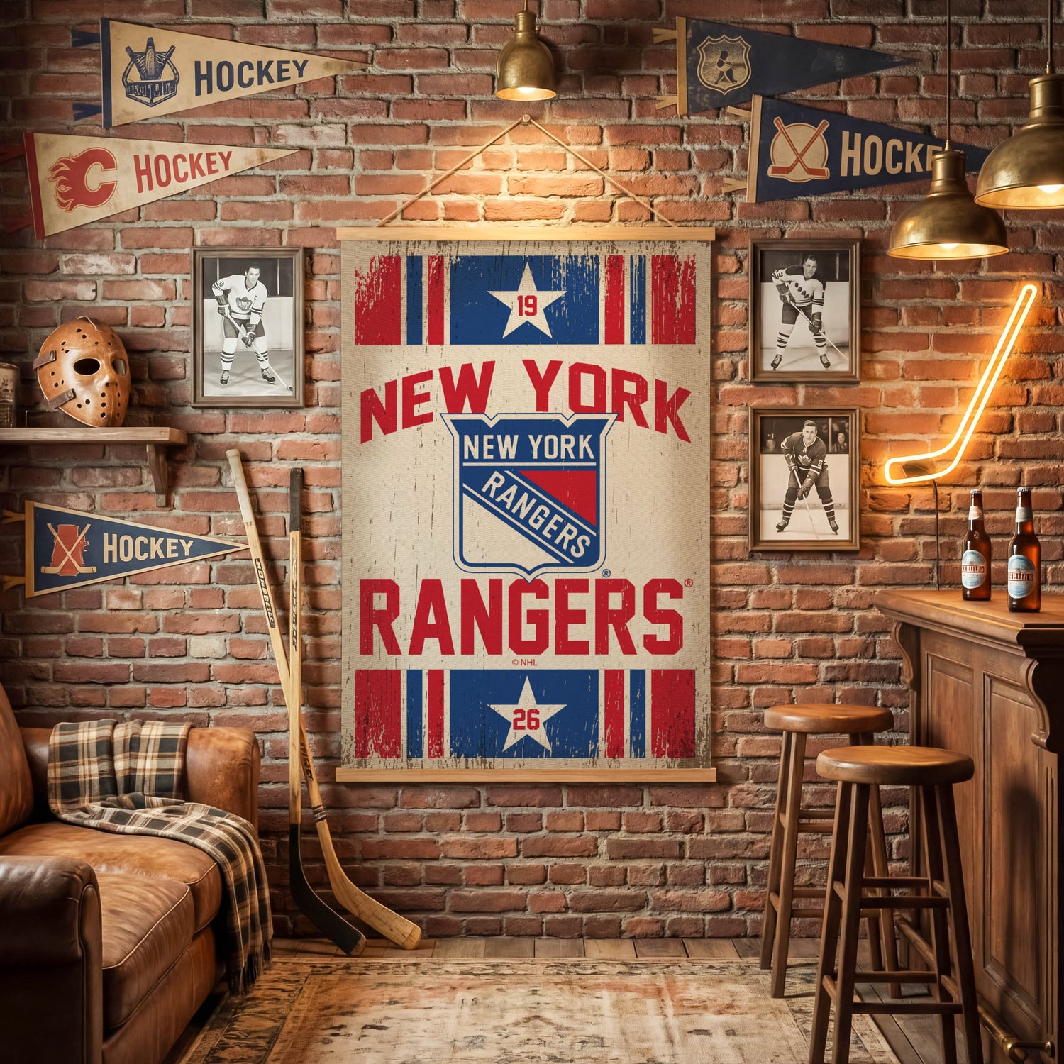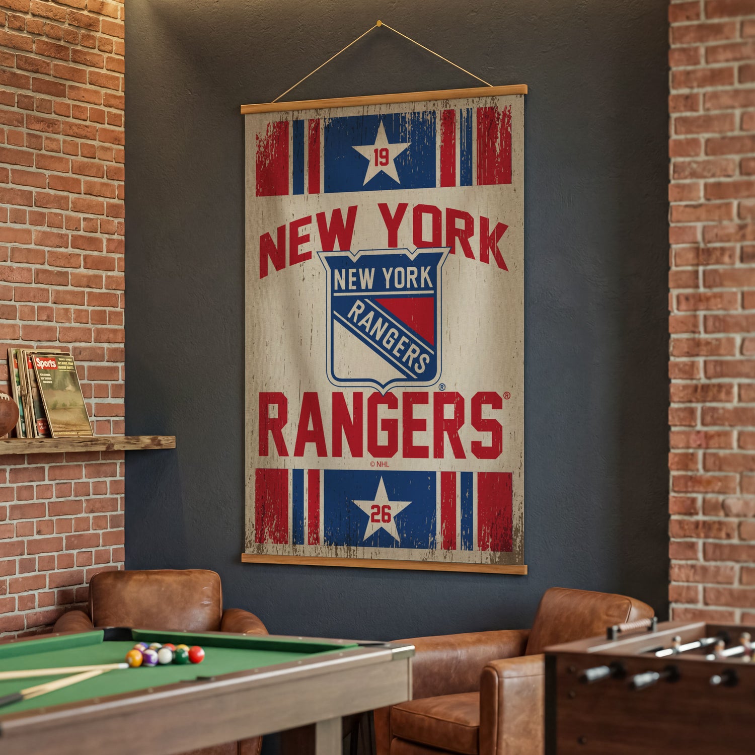 This New York Rangers Canvas Wall Tapestry brings NHL pride to interiors with a large design that reads clearly from across the room and anchors fan spaces with wall art. Made from a balanced blend of canvas textile and teak wood, this indoor piece combines a substantial feel with a clean, finished look, while its slim profile makes it simple to hang and reposition as assortments change. A three-piece construction assembles quickly for straightforward merchandising, and the New York Rangers design provides instant recognition for fans. Low-maintenance care keeps this tapestry display-ready season after season.