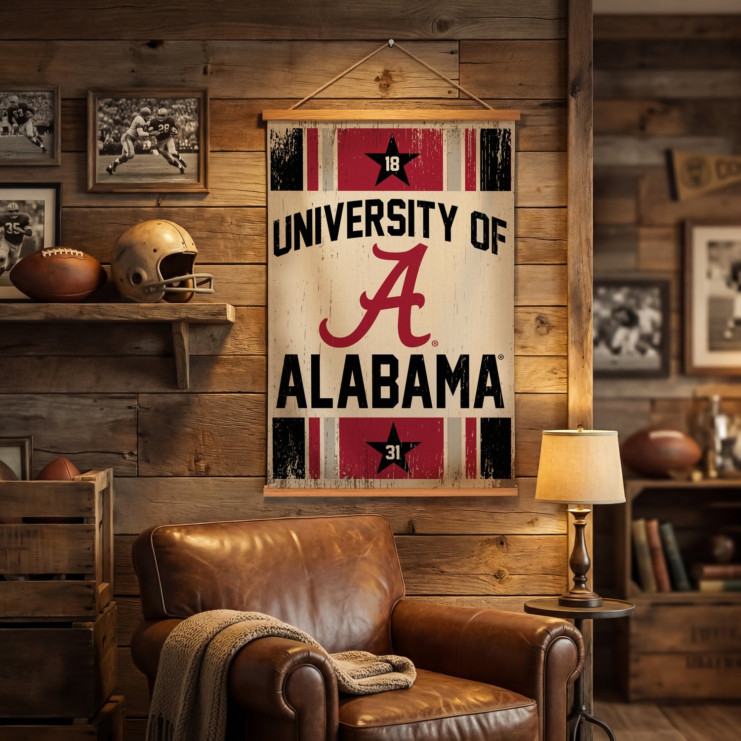 Showcase team pride with this University of Alabama Canvas Wall Tapestry, a medium accent that pairs gallery-style canvas with warm teak wood for a polished finish. This multicolored NCAA piece brings bold Alabama Crimson Tide spirit to living rooms, dorms, offices, and fan caves, making it a versatile choice for home decor and standout wall decor. Durable materials and an easy wipe-clean care routine support everyday display, while the streamlined profile suits a variety of retail assortments and gifting occasions.