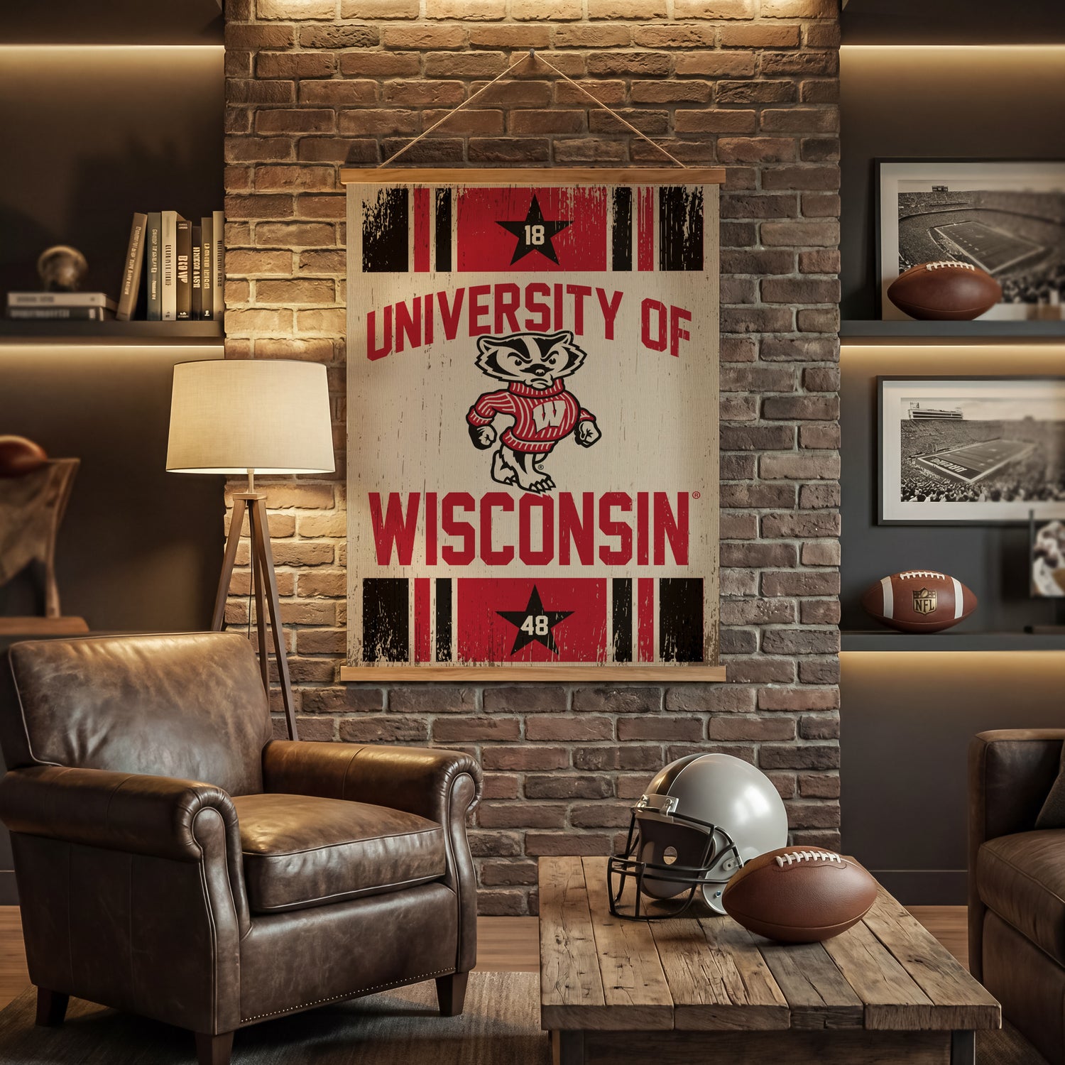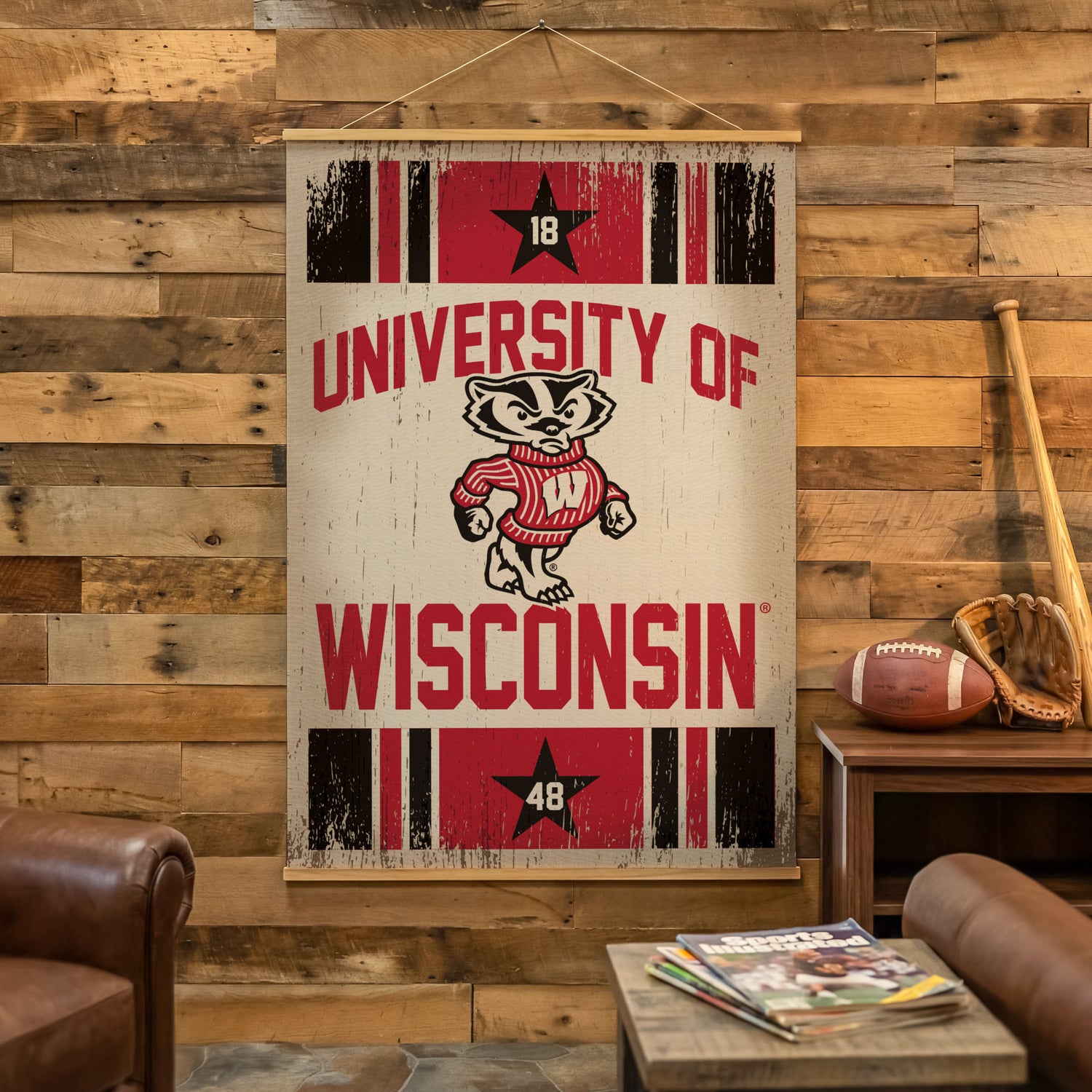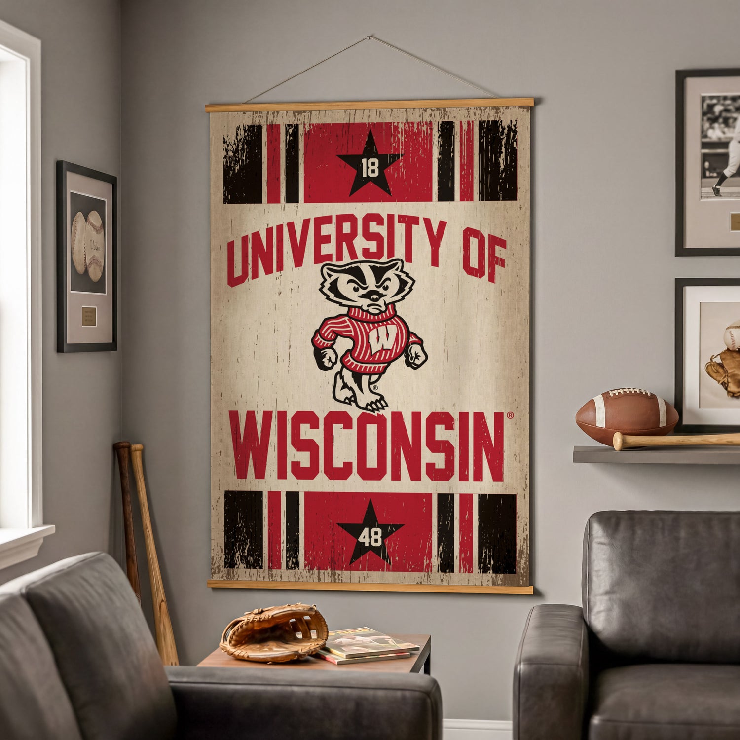 Showcase University of Wisconsin–Madison spirit with this Canvas Wall Tapestry, a large statement piece built for indoor wall hanging décor. Crafted from canvas, this wall tapestry brings the university logo into focus with a clean, dimensional look that stands out in living spaces, offices, and fan areas; as a large wall tapestry, it anchors gallery walls and makes impactful dorm decor without taking up floor space. Retailers gain a high-visibility collegiate accent with strong giftability for students, alumni, and fans across seasons.