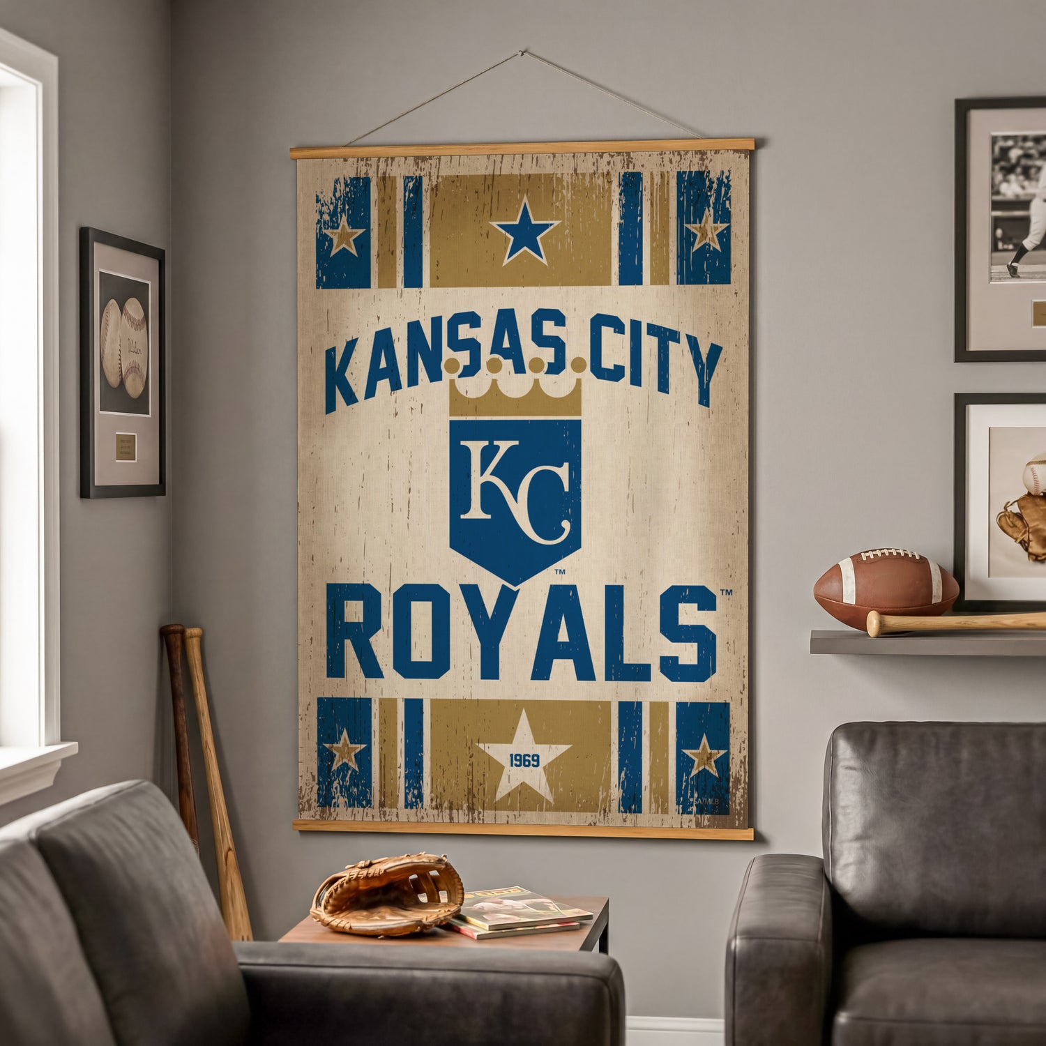 Celebrate Kansas City Royals pride with this large 54 x 36 Canvas Wall Tapestry, a bold piece of canvas art sized to anchor baseball decor in fan caves, living areas, dorms, and offices. Crafted on durable canvas with a clean, fabric-forward presentation, the expansive format delivers standout wall impact while keeping a modern, streamlined look that suits a range of interiors. Designed for fan memorabilia displays and MLB-themed assortments, it offers high visual presence, easy cross-merchandising with team accessories, and strong gift appeal for birthdays, holidays, and game-day celebrations.