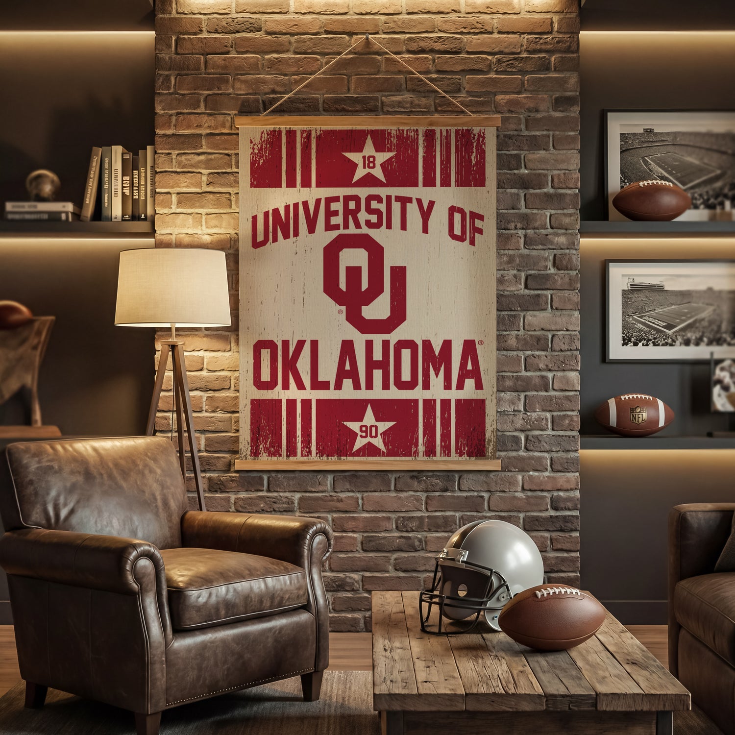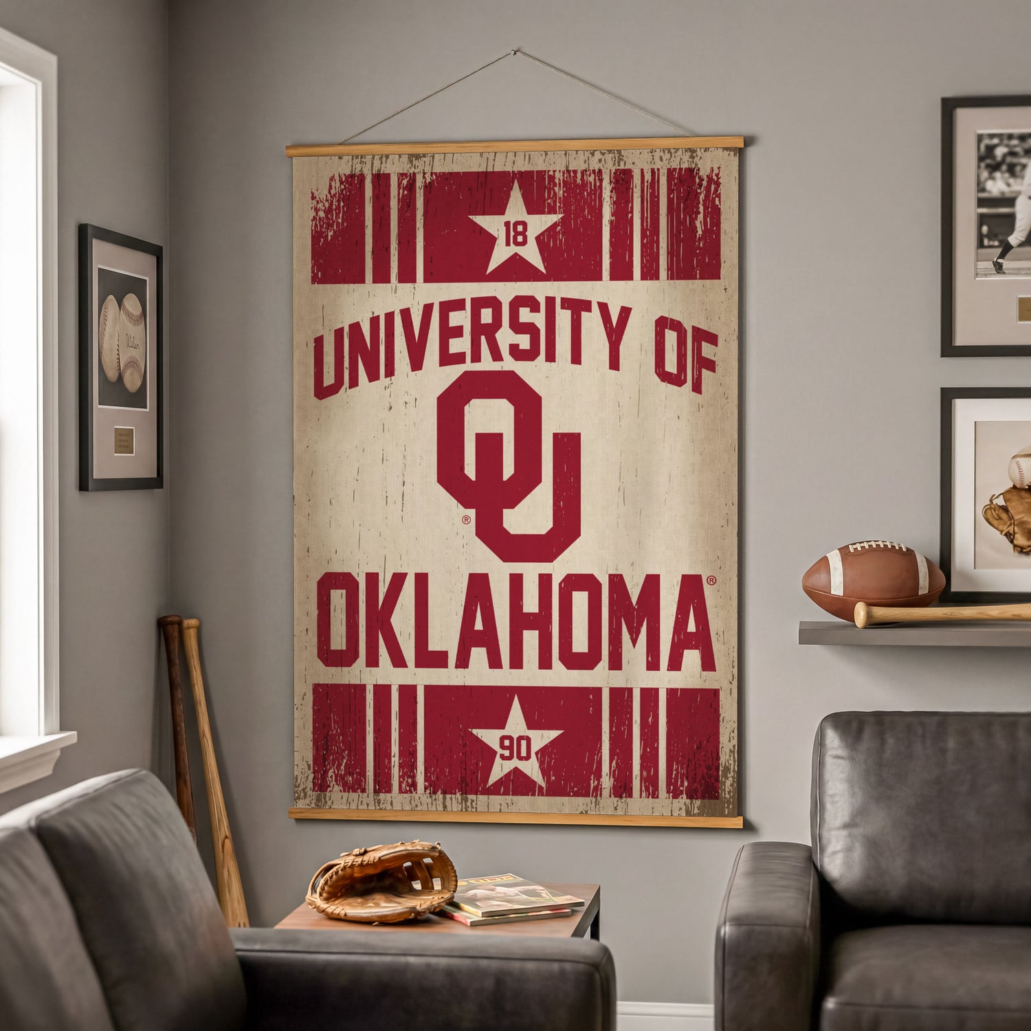 This University of Oklahoma Canvas Wall Tapestry delivers bold team spirit in a large-format statement piece designed for fan-focused spaces and collegiate assortments. This wall tapestry showcases the University of Oklahoma Sooners in a clean, fabric-based presentation that reads as versatile canvas wall art; ideal for fan zones, dorms, offices, and man cave decor. The canvas construction provides a substantial look and feel while keeping the focus on team pride, making it an impactful, giftable addition to sports décor and collegiate gifting collections.