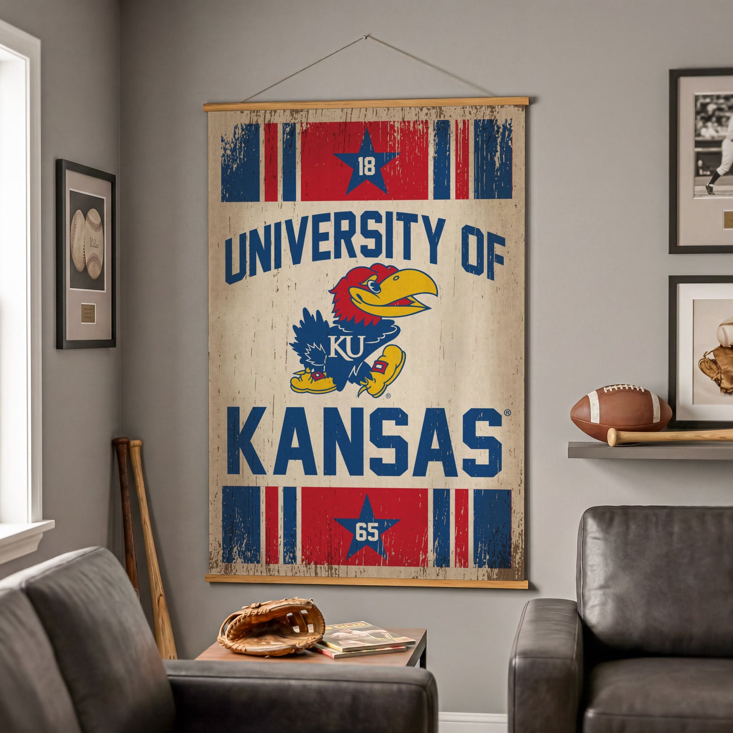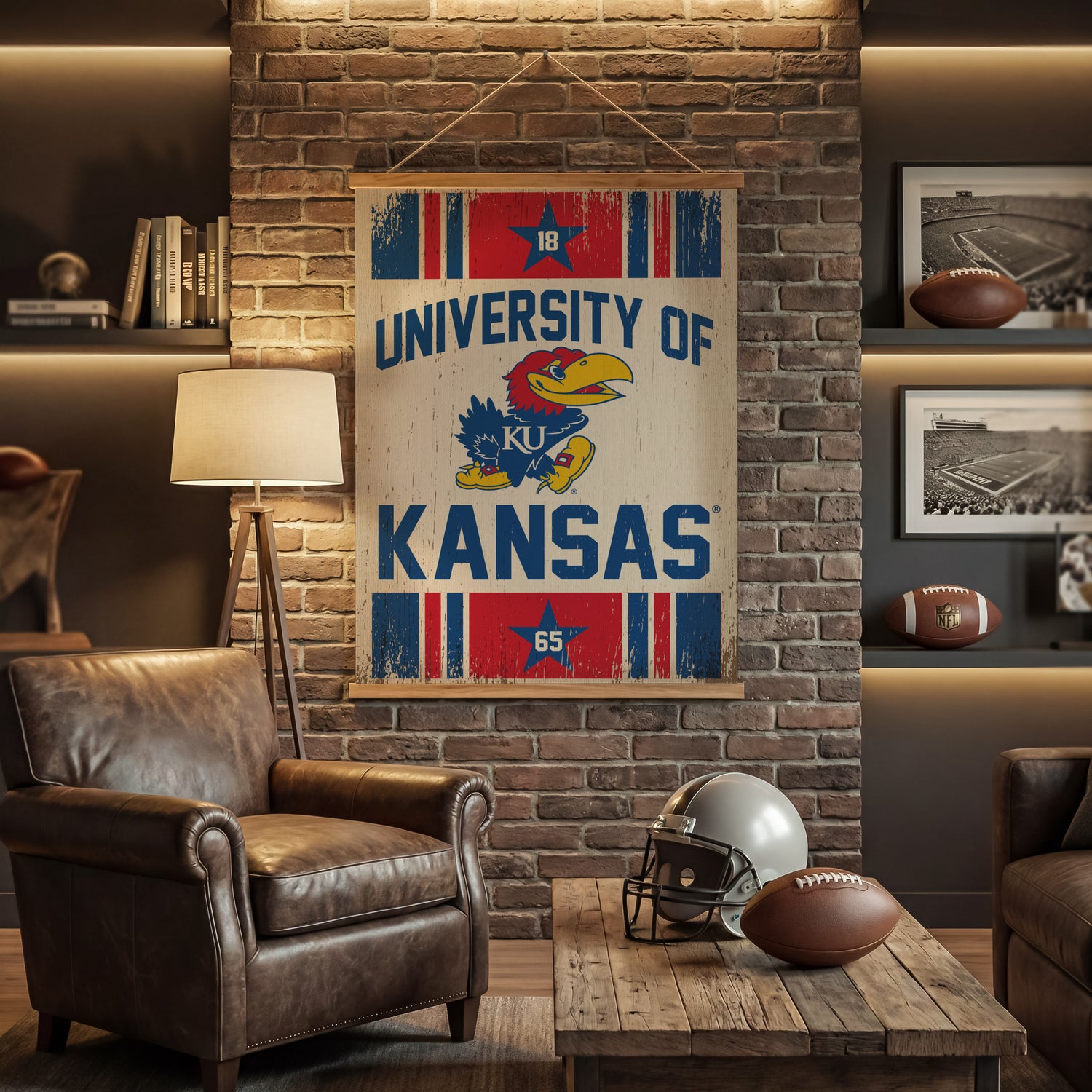 This large University of Kansas Canvas Wall Tapestry delivers a bold, ready-to-display expression of team pride for NCAA fans. The substantial scale reads from across the room while staying lightweight for straightforward mounting. The three-piece build assembles quickly and fits a range of indoor wall decor settings, offering a clean, polished look that complements fan caves and giftable assortments alike. Simple care keeps the piece looking fresh year-round.