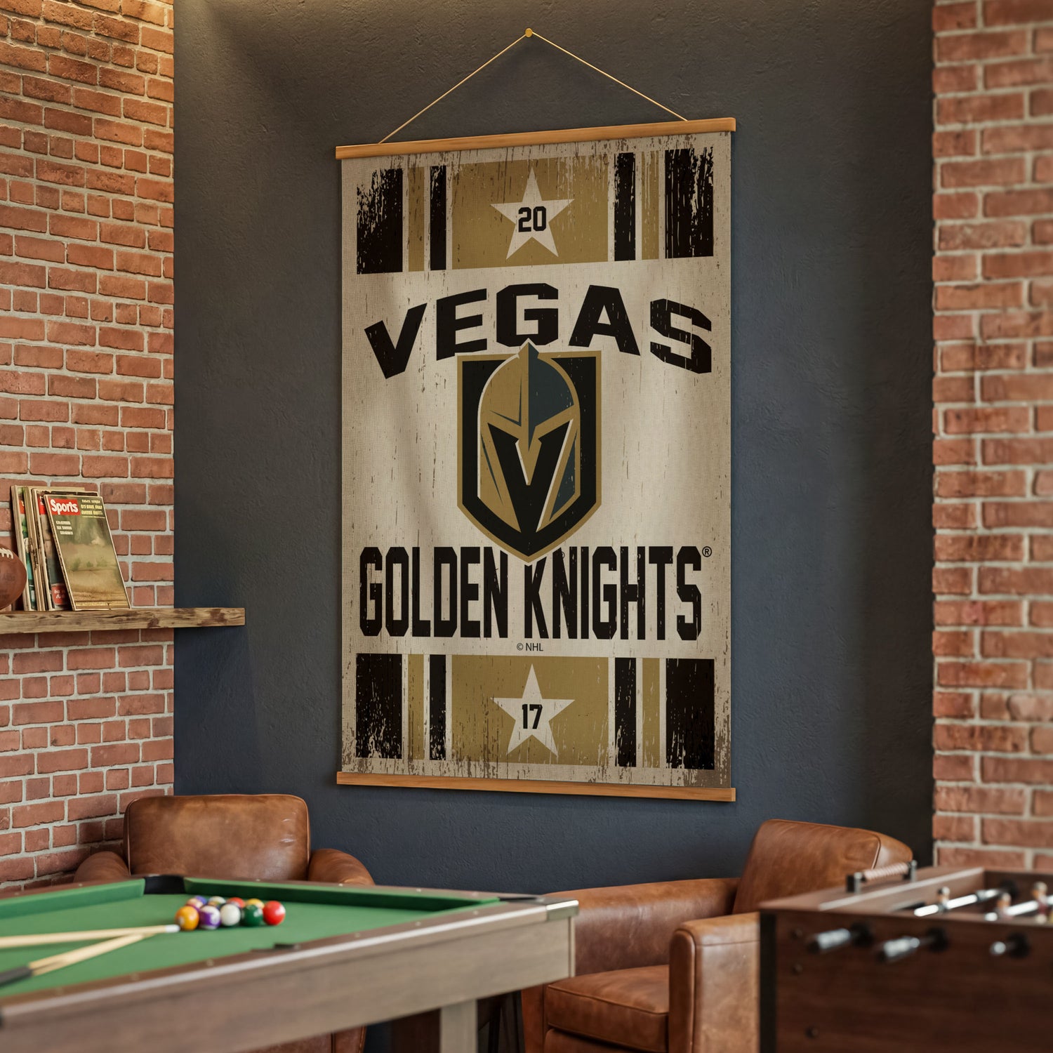 Bring NHL spirit to any interior with this Large Vegas Golden Knights Canvas Wall Tapestry, a striking piece of canvas wall art sized at 54 x 36 inches that creates an instant focal point in living rooms, offices, and fan caves. The canvas and wood/teak construction offers tactile texture and a warm, dimensional look, while the slim profile and lightweight design make it easy to position as standout wall decor without overwhelming the space. Featuring a multicolored Vegas Golden Knights design, this three-piece indoor accent arrives ready for assembly and maintains its clean appearance with simple care, delivering a durable, giftable wall tapestry solution for sports-focused assortments and fan-forward displays.